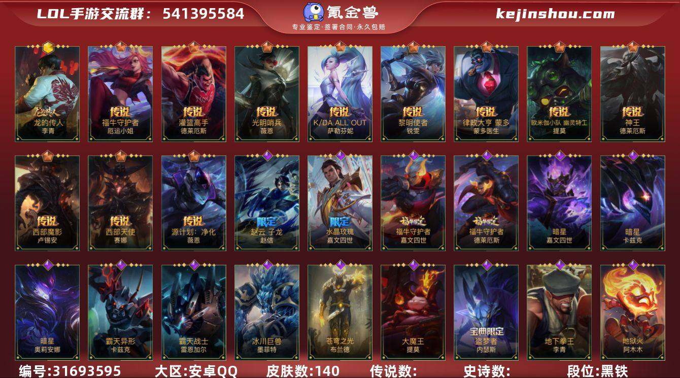 【编号89929】【店长推荐捡漏号】104英雄-140皮肤 【神话皮肤】:龙的传人 李青 【限定皮肤】:龙的传人 李青,赵云 子龙 赵信,水晶玫瑰 嘉文四世,关羽 云长 泰达米尔 【传说皮肤】:源计划:净化 薇恩,光明哨兵 薇恩,K/DA ALL OUT 萨勒芬妮,西部魔影 卢锡安,欧米伽小队 幽灵特工 提莫,律政大亨 蒙多医生,福牛守护者 厄运小姐,灌篮高手 德莱厄斯,神王 德莱厄斯,黎明使者 锐雯,西部天使 赛娜 【史诗皮肤】:钢铁军团 盖伦,霸天剑魔 亚托克斯,睡衣守护者 拉克丝,惊悚派对 阿木木,地狱火 阿木木,霸天战士 雷恩加尔,丧尸 努努和威朗普,暗星 奥莉安娜,泳池派对 奥莉安娜,腥红之月 黛安娜,赵云 子龙 赵信,猎龙勇士 赵信,霸天异形 卡兹克,暗星 卡兹克,末路管家 布隆,源计划:升华 烬,腥红之月 崔斯特,K/DA ALL OUT 卡莎,神龙尊者 玉境灵龙 卡莎,猎龙勇士 潘森,铁血女忍 阿卡丽,源计划:暗影 阿卡丽,玉剑传说 无双 菲奥娜,福牛守护者 菲奥娜,战场之王 布里茨,福牛守护者 安妮,战场之王 亚索,源计划:阴 劫,未来战士 卢锡安,源计划:山 蕾欧娜,娜就去看看 崔丝塔娜,大魔王 提莫,银河魔装机神 希瓦娜,秘旅探索者 希瓦娜,炼狱魔女 蔚,源代码 卡蜜尔,星域审判官 卡蜜尔,暗星 嘉文四世,水晶玫瑰 嘉文四世,福牛守护者 嘉文四世,地下拳王 李青,盗梦者 内瑟斯,玉剑传说 无极 易,西部魔影 德莱厄斯,福牛守护者 德莱厄斯,禁卫机甲 格雷福斯,玉剑传说 风仙子 迦娜,破败军团 德莱文,福牛守护者 阿利斯塔,冰川巨兽 墨菲特,虚空海灵 菲兹,绒毛 菲兹,欧米伽小队 鬼影蛙人 菲兹,光明哨兵 锐雯,白色死神 韦鲁斯,西部天使 艾瑞莉娅,冬境仙灵 索拉卡,睡衣守护者 伊泽瑞尔,星之守护者 伊泽瑞尔,秘旅探索者 加里奥,战斗学院 阿克尚,猎龙勇士 奥拉夫,苍穹之光 布兰德...