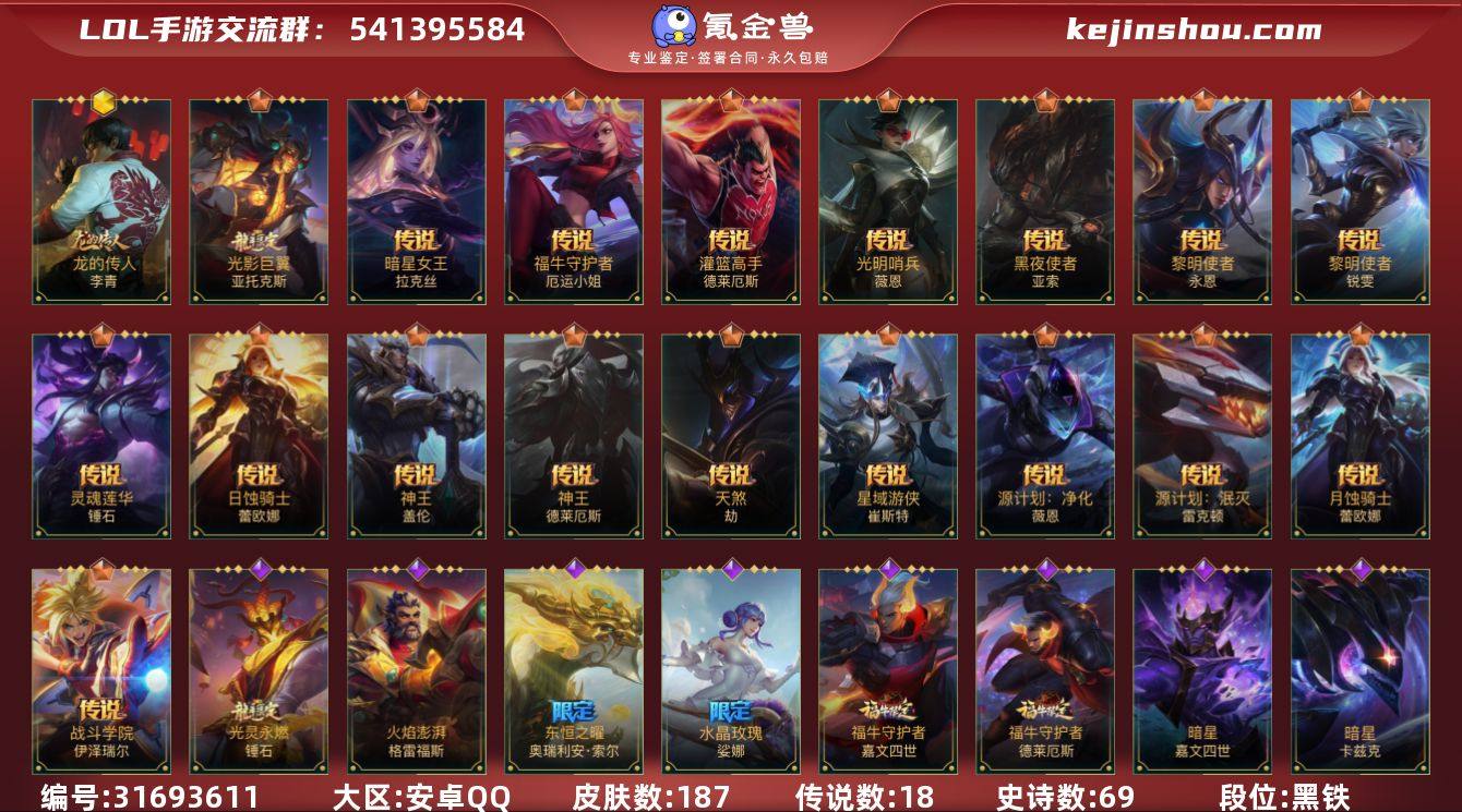 【编号62772可秒换绑】店长推荐特价处理精品号 111英雄-187皮肤 【神话皮肤】:龙的传人 李青 【限定皮肤】:龙的传人 李青,钢铁军团 拉克丝,水晶玫瑰 娑娜 【传说皮肤】:神王 盖伦,光影巨翼 亚托克斯,暗星女王 拉克丝,源计划:净化 薇恩,光明哨兵 薇恩,星域游侠 崔斯特,黑夜使者 亚索,天煞 劫,日蚀骑士 蕾欧娜,月蚀骑士 蕾欧娜,福牛守护者 厄运小姐,黎明使者 永恩,灌篮高手 德莱厄斯,神王 德莱厄斯,黎明使者 锐雯,战斗学院 伊泽瑞尔,源计划:泯灭 雷克顿,灵魂莲华 锤石 【史诗皮肤】:钢铁军团 盖伦,星之守护者 拉克丝,殇之机器人 阿木木,丧尸 努努和威朗普,地狱行者 孙悟空,探梦奇旅 艾克,暗星 奥莉安娜,腥红之月 黛安娜,暗星 卡兹克,烘焙童谣 悠米,末路管家 布隆,圣诞老人 布隆,灭迹行者 烬,圣龙 奥瑞利安·索尔,东恒之曜 奥瑞利安·索尔,未来战士 崔斯特,K/DA ALL OUT 卡莎,猎龙勇士 潘森,铁血女忍 阿卡丽,福牛守护者 菲奥娜,海之歌 萨勒芬妮,福牛守护者 安妮,源计划:阴 劫,灵能特工 劫,武神 贾克斯,秘旅探索者 贾克斯,欧米伽小队 魔鬼伞兵 崔丝塔娜,娜就去看看 崔丝塔娜,小蜜蜂 提莫,水晶玫瑰 娑娜,泳池派对 璐璐,寒冬精灵 璐璐,秘旅探索者 希瓦娜,炼狱魔女 蔚,暮星之羽 霞,暗星 嘉文四世,福牛守护者 嘉文四世,地下拳王 李青,电玩上校 库奇,柯基 库奇,奈落之炎 凯南,盗梦者 内瑟斯,灵魂莲华 永恩,福牛守护者 德莱厄斯,光焰澎湃 格雷福斯,灵魂收割者 德莱文,破败军团 德莱文,福牛守护者 阿利斯塔,银河魔装机神 菲兹,虚空海灵 菲兹,绒毛 菲兹,欧米伽小队 鬼影蛙人 菲兹,泳池派对 吉格斯,电玩勇者 锐雯,玉剑传说 武剑仙 锐雯,白色死神 韦鲁斯,暗星 韦鲁斯,死亡誓约 卡特琳娜,秘旅探索者 加里奥,苍穹之光 布兰德,战场之王 布兰...