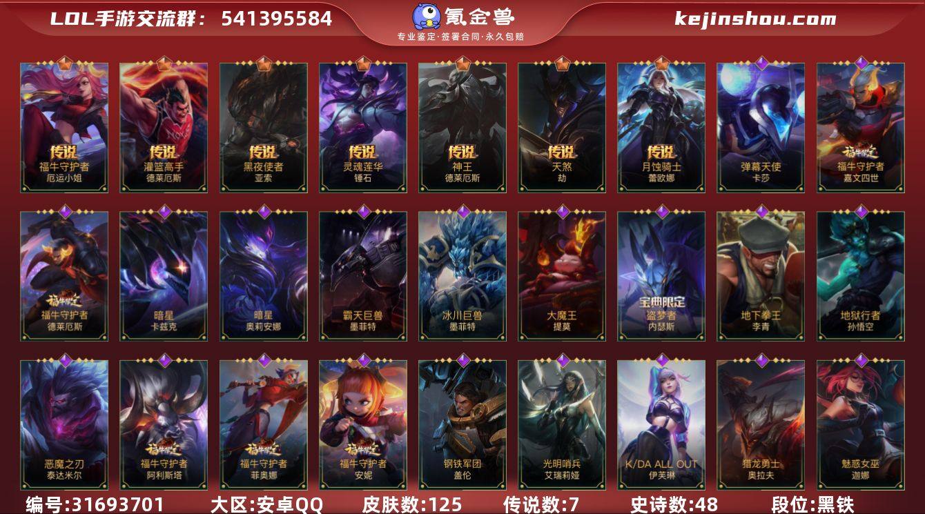 【编号18835可秒换绑】店长推荐特价处理精品号 111英雄-125皮肤 【传说皮肤】:黑夜使者 亚索,天煞 劫,月蚀骑士 蕾欧娜,福牛守护者 厄运小姐,灌篮高手 德莱厄斯,神王 德莱厄斯,灵魂莲华 锤石 【史诗皮肤】:钢铁军团 盖伦,腥红之月 亚托克斯,战斗学院 拉克丝,殇之机器人 阿木木,星域先知 卡尔玛,地狱行者 孙悟空,暗星 奥莉安娜,泳池派对 奥莉安娜,恶魔之刃 泰达米尔,暗星 卡兹克,灭迹行者 烬,弹幕天使 卡莎,K/DA ALL OUT 伊芙琳,福牛守护者 菲奥娜,星之守护者 萨勒芬妮,福牛守护者 安妮,武神 贾克斯,泳池派对 蕾欧娜,小恶魔 崔丝塔娜,大魔王 提莫,星之守护者 璐璐,银河魔装机神 希瓦娜,秘旅探索者 希瓦娜,魔女 卡蜜尔,福牛守护者 嘉文四世,地下拳王 李青,盗梦者 内瑟斯,福牛守护者 德莱厄斯,泳池派对 格雷福斯,战斗教授 格雷福斯,魅惑女巫 迦娜,福牛守护者 阿利斯塔,霸天巨兽 墨菲特,冰川巨兽 墨菲特,绒毛 菲兹,暗星 韦鲁斯,光明哨兵 艾瑞莉娅,源计划:雄心 卡特琳娜,战斗学院 卡特琳娜,源代码 索拉卡,秘旅探索者 加里奥,神奇先驱 杰斯,猎龙勇士 奥拉夫,泳池派对 雷克顿,真实伤害 赛娜,梦境灵探 赛娜,未来战士 锤石,盗梦暗影 锤石 【赛季皮肤】:s1光耀之刃,s2光耀之芒,s3光耀之灵,s4光耀之心,s5绯金魅影,s6绯金丽刃,s7绯金战斧,s8绯金鮫灵,s9王牌舰长,s10王牌上将,s11王牌司令 【其他皮肤】:海上霸主 盖伦,游侠法师 拉克丝,暗黑武士 雷恩加尔,三昧真火 孙悟空,斗战胜佛 孙悟空,猎龙勇士 薇恩,哥特女仆 奥莉安娜,光耀之心 奥莉安娜,暗黑女武神 黛安娜,光耀之刃 泰达米尔,秘密特工 赵信,死亡绽放 卡兹克,光耀之芒 金克丝,猎龙勇士 布隆,狮心 布隆,王牌舰长 崔斯特,绯金魅影 伊芙琳,银色之牙 阿卡丽,绯金丽刃 菲奥娜,小红帽...