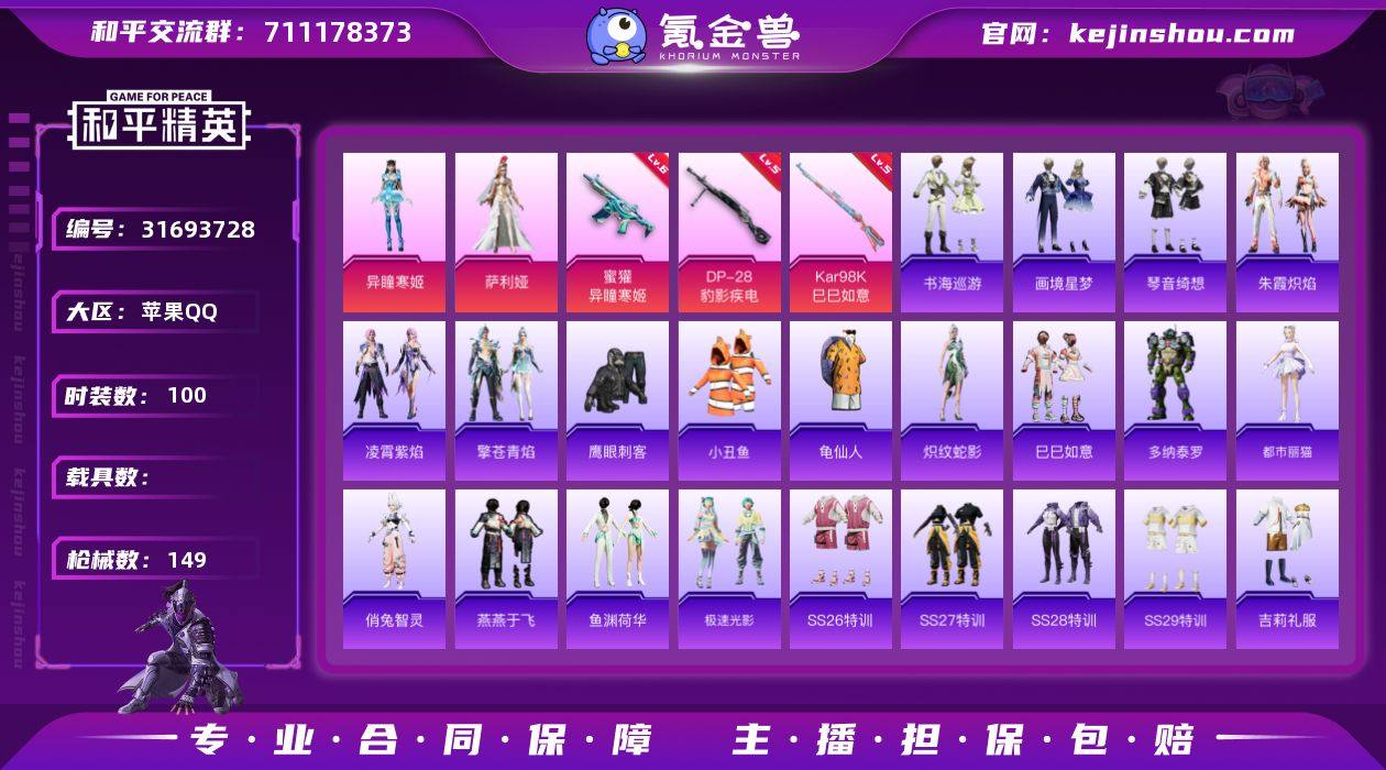 苹果 手Q-2粉装-5特效枪-0载具-2粉色飞行器-41297热力值-1王牌印记-100套装-149枪皮 【热门品类】:套装-小丑鱼,套装-龟仙人 【粉色套装】:角色-萨利娅,角色-异瞳寒姬 【粉色枪皮等级】:蜜獾-异瞳寒姬(六级),AKS-74U-森灵之息(五级),Kar98K-巳巳如意(五级),DP-28-豹影疾电(五级) 【粉色枪皮】:蜜獾-异瞳寒姬,AKS-74U-森灵之息,Kar98K-巳巳如意,Mk14-福马献瑞,DP-28-豹影疾电 【粉色飞行器】:炫彩糖果飞行器,鎏金朋克飞行器 【粉色降落伞】:蜜语绒猫降落伞,巴啦啦小魔仙降落伞,千金淑猫降落伞,炫彩糖果降落伞,罪夜之冕降落伞 【稀有套装】:套装-龟仙人,套装-炽纹蛇影,套装-巳巳如意,套装-雪国风尚,套装-炫彩糖果,角色-多纳泰罗,角色-都市丽猫,角色-俏兔智灵,套装-燕燕于飞,套装-鱼渊荷华,套装-极速光影,套装-朱霞炽焰,套装-凌霄紫焰,套装-擎苍青焰,套装-书海巡游,套装-画境星梦,套装-琴音绮想,套装-红釉青花 【稀有枪皮】:AUG-冰晶雪宝,AKM-星之彼岸,AKM-破晓战魂,AKM-龙的传人,M16A4-幻世战舞者,M16A4-千金淑猫,SCAR-L-炫彩节奏,SCAR-L-玉兔迎春,SCAR-L-红色方程式,M416-糯团青竹,M416-蓝色火焰,GROZA-影袭,AUG-天降萌叽,AUG-怪笑疯兔,AUG-闲梦青缨,QBZ-彩虹符号,蜜獾-天降萌叽,蜜獾-绯穹魔姬,ACE32-画境星梦,ARX-凌霄紫焰,UZI-啾咪啾咪,UZI-影袭,UMP45-夜灯,UMP45-极意拳锋,Vector-焰鹰斗篷,Vector-创世·救赎,Vector-动力核心,汤姆逊-天降萌叽,MP5K-画境星梦,JS9-凌霄紫焰,P90-巳巳如意,Kar98K-幻影战神,Kar98K-影袭,M24-影袭,M24-炫彩节奏,AWM-焰鹰斗篷,M1加兰德-画境星梦,S686-生命誓言,S686-巳巳如意,S686-千金淑猫,S12K-夜灯,S12K-极意拳锋,DBS-焰鹰斗篷,DBS-创世·救赎,AA12-G-炫光之旅,AA12-G-画境星梦,DP-28-焰鹰斗...