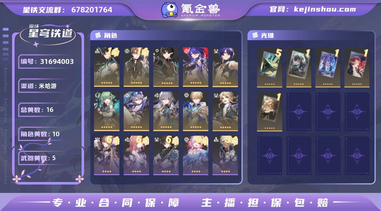 总黄数:16 五星光锥数:5 五星角色数:10 开拓等级:68 开拓者性别:女 星轨专票:0 梦华数量:0 星琼数量:154 1命丹恒·饮月,1命瓦尔特,0命丹恒·腾荒,0命黄泉,0命真理医生,0命藿藿,0命银狼,0命布洛妮娅,0命杰帕德,0命彦卿 5精星海巡航,1精比阳光更明亮的,1精雨一直下,1精银河铁道之夜,1精如泥酣眠 换绑材料:可提供换绑材料 邮箱状态:未绑定 psn绑定情况:否 taptap绑定情况:否 邮箱实名情况:邮箱已实名 卖家说:急出多少都行
