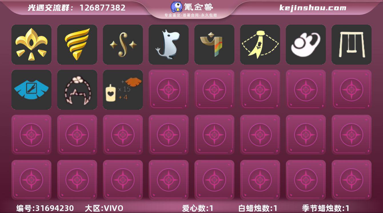 蜡烛数量:72 爱心数量:93 季节蜡烛数量:8 翼数量:220 拾光季,归巢季,九色鹿季 织光季花瓣斗篷,瑞雪斗篷,遥鲲斗篷,蝴蝶斗篷,白鸟斗,黑金,白金,红金,归巢围巾斗,绿芽,圣诞斗,海洋斗,彩虹斗,樱花斗,紫罗兰斗,郁金香斗,马蹄莲斗,粉浴巾,蓝浴巾,黄浴巾 平菇发型,雨妈发型,公主头,水母头发型,总裁发型,归巢毕业发型,正太,书虫,高马尾,粗辫,虚荣,花环,若笠,明制,樱花,猫耳,女巫 武士裤,白棉裤,搓澡巾,雪人裤,猫猫裤 织光季横纹面具,织光季裂纹面具,黄鼠狼,矮人面具,黑脸,龙头,兔头 肯德基联动眼镜,黑框眼镜,红耳机,星星眼镜,烟花耳坠,蔚蓝眼镜 冰晶滑雪板,荧光珠穗耳饰,冥龙地毯,谜题笼,蛛网挂饰,暮星篇海报,海牛玩具,蓝色星星地毯,螃蟹,摆件金钱树,鲲灯,遥鲲玩偶,小风车,琵琶,纸风车,水管,水晶罐,相机,姆明全家福,光球,雨伞,笛子,吉他,火盆,烟花棒,圣诞椅,万圣椅,雪桶,蹦迪灯,气球,坐垫,海螺,火炬 枯叶发饰,红色耳机,小红花,羽毛发卡,花环-头饰,蝴蝶结-头饰,太阳帽,蓝色音乐会,小丑帽,七夕发饰,魔术帽,松果发饰 优雅领结,九色鹿季节项链,风行毛领,海螺项链,海龟项链,圣诞领结,海浪围巾 人字拖 宝骏丹心马尾礼包,冬日围巾斗篷,渐变双马尾发型礼包,线框斗篷礼包,鹿角,瑞雪,橘子,红伞,雪花,星月头饰,四叶草,雪人鞋,新年耳钉 卖家说:从魔法季到织光季的季节任务都做完了,墓土完成80%禁阁完成90%,晨岛.云野.雨林.霞谷都已毕业,充了大概1Q多点,可以小刀