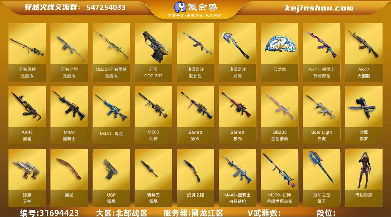/北部/黑龙江区/可排位/段位未定段/Lv.89 中将2/VIP5/58V/【四防传说】/传说影煞/【幻神三件套】/幻神/幻神音效卡/幻神荣耀世冠白鲨/王者风神/QBZ金色蔷薇/白虎/青龙/QBZ王者蔷薇/COP幻灵/USP雷暴/五套幻灵雷/四套雷暴雷/【四防角色】/隼/王者葵惊若翩鸿/王者影豹/【角色】/奇洋探员/电竞少女/流浪蔷薇/【小人枪】/斯泰尔蝴蝶/雷神小红/【道具】/永久烟雾头/护目镜/各种戒指/各种光效/各种玩偶/永久AC/永久雷包/细节看图/【此账号未被封过十年】