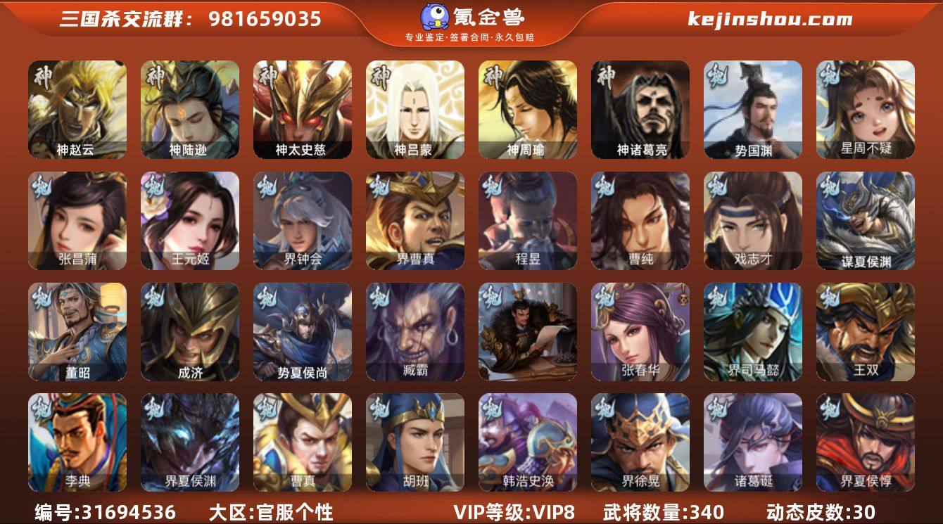 官阶:大将军;VIP等级:VIP8;史诗武将数量:35;动态皮肤数量:30;武将总数:340;史诗宝珠数量:5;将魂数量:12795;神将:4;魏国史诗武将:6;蜀国史诗武将:7;吴国史诗武将:8;群史诗武将:9 神赵云,神陆逊,神太史慈,神诸葛亮,星周不疑,张昌蒲,王元姬,界钟会,界曹真,曹纯,戏志才,势国渊,程昱,谋诸葛亮,谋夏侯氏,谋赵云,谋马超,沙摩柯,谯周,花鬘,周处,吴景,孙寒华,骆统,界朱然,界徐盛,势陆郁生,势太史慈,左慈,麹义,南华老仙,界李儒,许攸,星董卓,兀突骨,司马昭,神吕蒙,神周瑜,势夏侯尚,SP关羽,SP蔡文姬,乐进,曹昂,诸葛诞,朱灵,文聘,SP姜维,张春华,钟会,曹冲,郭淮,满宠,界王异,界曹操,界司马懿,界夏侯惇,界张辽,界许褚,界郭嘉,李典,曹真,韩浩史涣,陈群,钟繇,司马朗,王基,郭皇后,辛宪英,界甄姬,吕虔,鲁芝,界荀彧,界徐晃,杜畿,界曹丕,界邓艾,界曹植,界曹彰,界满宠,界郭淮,卞夫人,界陈群,蔡贞姬,袁涣,王双,崔琰,阮慧,谋于禁,界曹休,牵招,胡班,成济,谋夏侯渊,界夏侯渊,臧霸,董昭,SP孙尚香,关银屏,夏侯霸,马良,关兴张苞,廖化,界马岱,关平,简雍,刘封,界法正,界关兴张苞,界刘备,界关羽,界张飞,界赵云,界马超,SP徐庶,吴懿,周仓,张松,夏侯氏,糜竺,李严,黄皓,界诸葛亮,界伊籍,界庞统,界姜维,吕凯,张翼,杨仪,邓芝,傅肜,陈震,费祎,糜夫人,界周仓,向宠,彭羕,谋庞统,谋张飞,李遗,霍峻,诸葛果,界魏延,蒋琬费祎,糜芳傅士仁,甘夫人,势陈祗,鲁肃,凌操,大乔小乔,诸葛恪,诸葛瑾,孙鲁育,程普,韩当,潘璋马忠,虞翻,朱然,界甘宁,界吕蒙,界黄盖,界周瑜,界大乔,界陆逊,孙鲁班,朱桓,顾雍,孙休,朱治,全琮,孙登,界孙权,界孙尚香,潘濬,严畯,吕岱,陆抗,许贡,卫温诸葛直,界韩当,界潘璋马忠,孙邵,桥公,张温,陈武董袭,孙翊,蒋钦,界顾雍,界孙鲁班,濮阳兴,谋吕蒙,谋周瑜,界孙休,界全琮,界朱治,谋小乔,张布,孟达,友庞统,伏完,刘协,界袁术,SP赵云,SP貂蝉,张宝,...