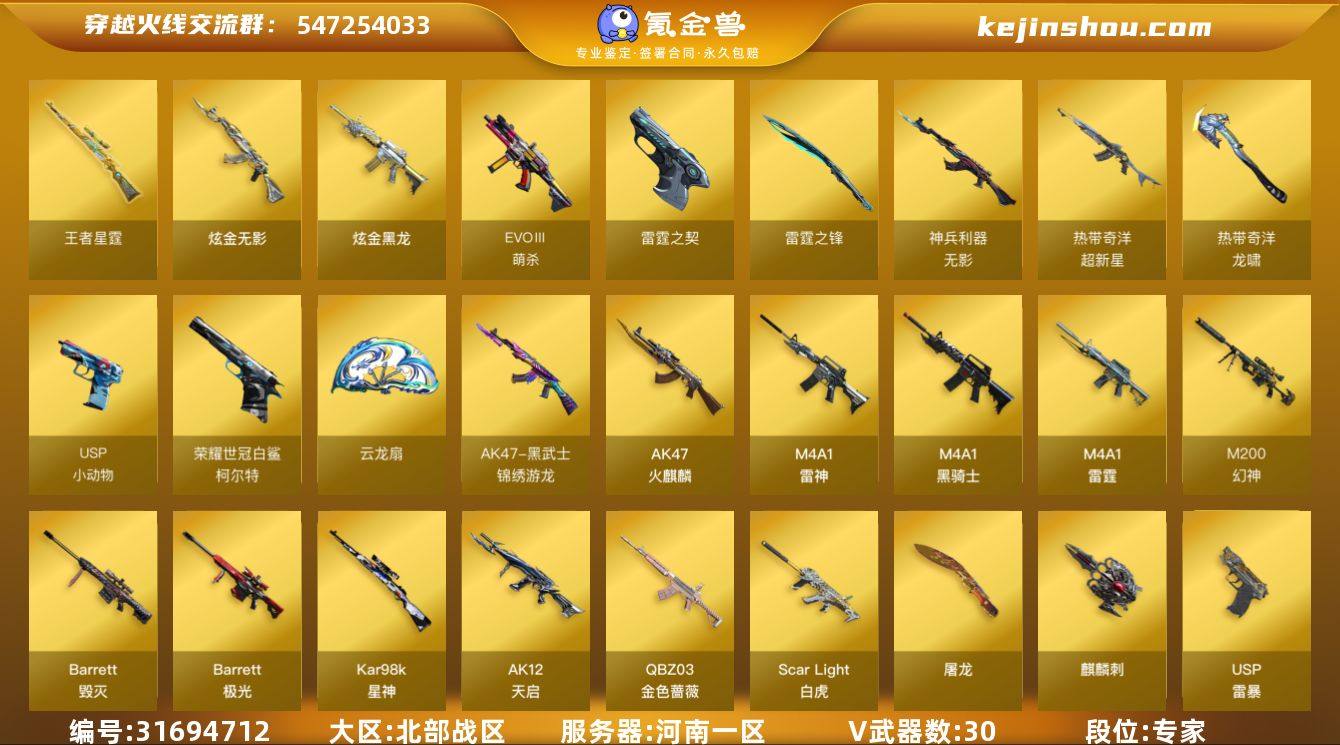 段位:专家 VIP等级:VIP6 V武器数:30 王者武器数:1 炫金武器数:2 王者星霆 炫金无影,炫金黑龙 EVOⅢ-萌杀,雷霆之契,雷霆之锋,无影-神兵利器,超新星-热带奇洋,龙啸-热带奇洋,USP-小动物,柯尔特-荣耀世冠白鲨2023,云龙扇,AK47-黑武士-锦绣游龙,AK47-火麒麟,M4A1-雷神,M4A1-黑骑士,M4A1-雷霆,M200-幻神,Barrett-毁灭,Barrett-极光,Kar98k-星神,AK12-天启,QBZ03-金色蔷薇,Scar Light-白虎,屠龙,麒麟刺,USP-雷暴,斩神刀-雷暴,幻灵之锋,裁决,柯尔特-冠军之特,G36C-幻影,龙啸-烈火龙威,擎天-云海游龙 传说影煞 关小雨,隐 云海游龙音效卡,M200-幻神音效卡 卖家说:极品爆破号,带5万7cf点,有幻神星神qbz音效卡,cop云龙五把,传说影煞,职业经理退游不玩了