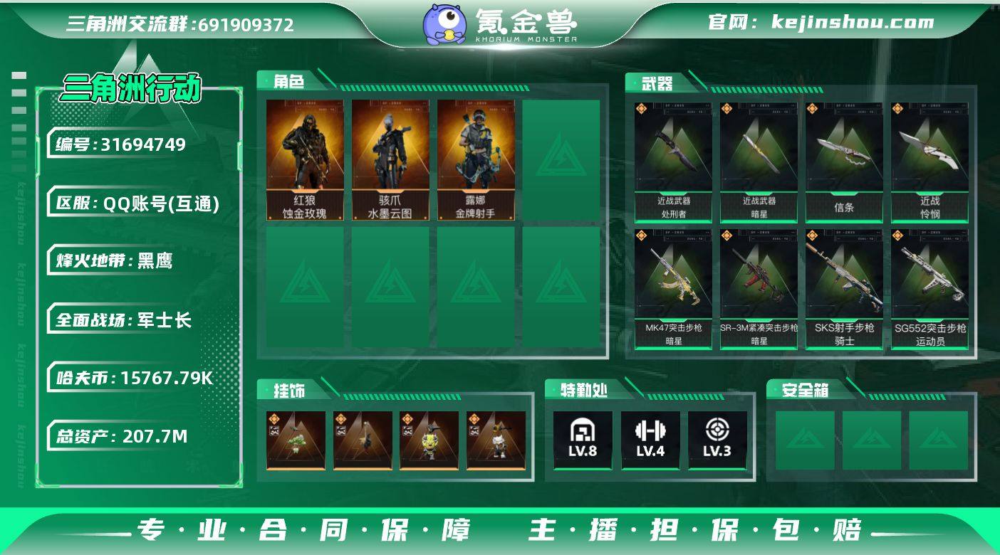 实名:不可二次实名 总资产:207.7M 哈夫币:15767.79K 烽火地带段位:黑鹰 烽火地带等级:60 全面战场段位:军士长 全面战场等级:44 8级仓库,4级训练中心,3级靶场,3级指挥中心,1级潜水中心,3级防具台,3级工作台,3级制药台,3级技术中心,1级收藏室 战术部门等级:3 战斗部门等级:2 医疗部门等级:1 研发部门等级:2 后勤部门等级:1 曼德尔砖-气象感应:0 曼德尔砖-命运王牌:0 曼德尔砖-电玩高手:0 曼德尔砖-美杜莎:0