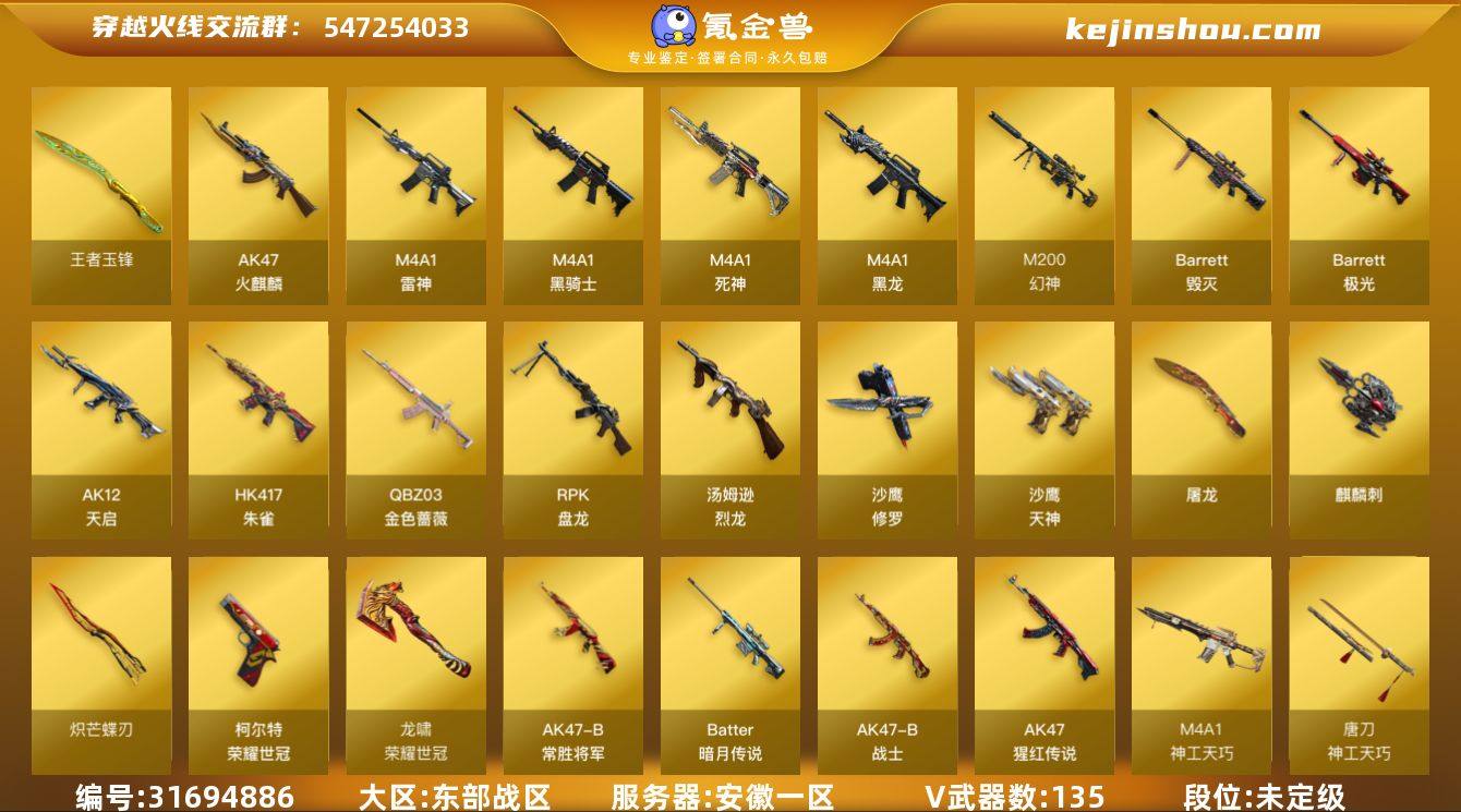 5600/东部/安徽一区/可排位/【宗师5】/【Lv.102 荣耀元帅】/VIP6/135V/【四防传说】/传说艾丽莎/传说夜影/幻神/幻神黄忠/QBZ金色蔷薇/QBZ冠军之薇/朱雀/*2/白虎之魄/朱雀电竞之星/雷霆王者套/柯尔特冠军之特/柯尔特荣耀世冠/*3/USP神工天巧/COP雷霆王者/*3/八套神工天巧雷/六套雷霆王者雷/【生化】/6盘龙/6烈龙/炼狱/*2/6修罗/炽芒蝶刃/斯泰尔幻面灵狐/炼狱迷你小刚/【挑战】/暴君乱世超越Max/地狱征服者超越Max【音效卡】/【无白虎】/白虎音效卡/雷神音效卡/黑骑士音效卡/毁灭音效卡/【枪皮】/毁灭星空/毁灭荣耀之怒/雷神荣耀世冠AG/雷神荣耀之魄/雷神虎将/黑骑士冠军之势/黑骑士地狱火/【四防角色】/电竞教官云悠悠/兰巾帼英雄/王者迷迭香/王者凌霄/【角色】/龙儿小淘气/晴雅/王者樱热浪之夏/虚空/幽/【小人枪】/Cat刀锋/M4A1蓝水晶斯沃特精英/AK47红水晶斯沃特精英/COP旗袍/COP斯沃特/海滩汪汪巴雷特【道具】/永久烟雾头/护目镜/超级背包/各种戒指/各种光效/各种玩偶/永久AC/永久雷包/细节看图/【此账号未被封过十年】