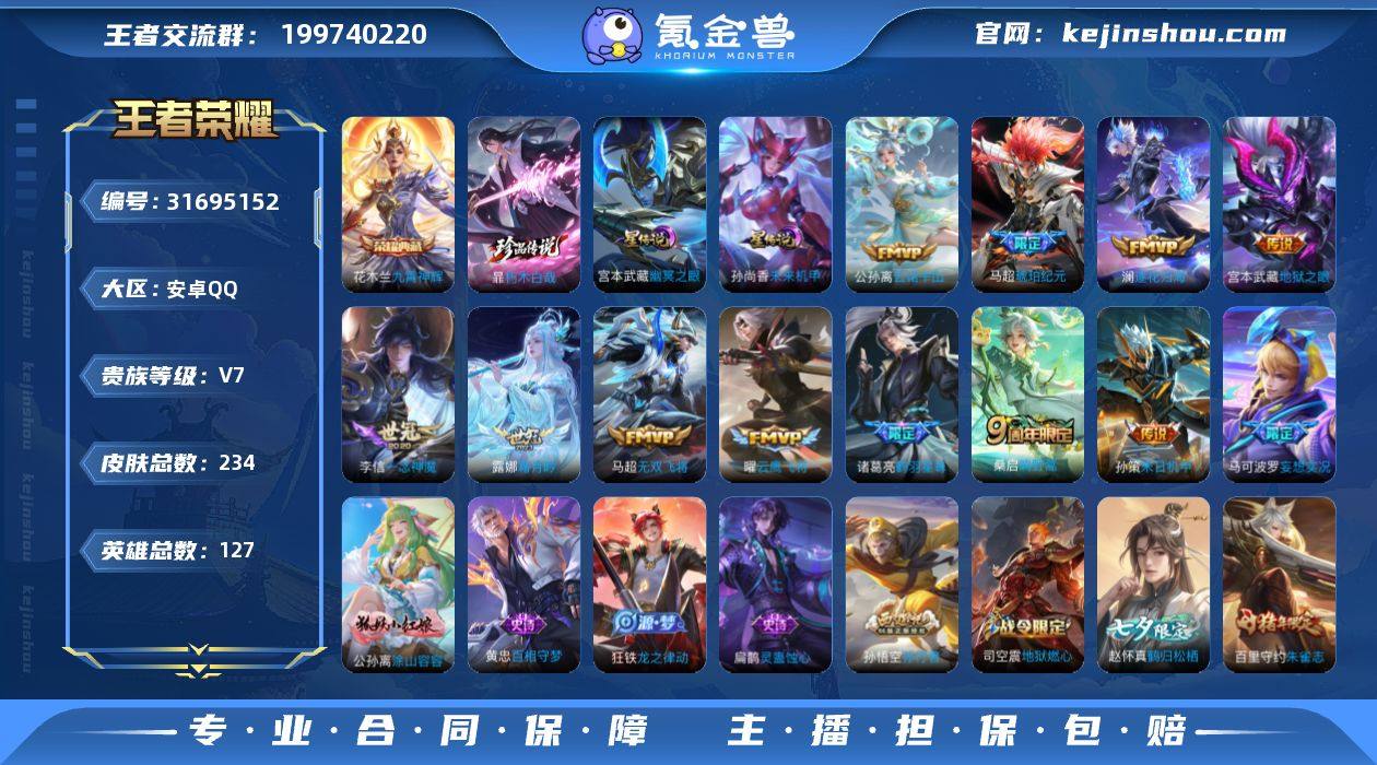 安卓Q-V7-尊贵铂金I段位-127英雄-234皮肤-1典藏皮肤-1珍品传说-12传说-69史诗【荣耀典藏】:花木兰九霄神辉【珍品传说】:暃朽木白哉【传说皮肤】:公孙离云诺千山,桑启鸣野蒿,马超琥珀纪元,澜逐花归海,露娜霜月吟,马可波罗妄想实况,诸葛亮鹤羽星尊,马超无双飞将,孙策末日机甲,曜云鹰飞将,李信一念神魔,宫本武藏地狱之眼 未来机甲 幽冥之眼【限定皮肤】:姜子牙天穹之誓,杨戬破阵退雄兵,狄仁杰阴阳师,赵云皇家上将,墨子神迹守卫,嬴政优雅恋人,庄周高山流水,高渐离玩趣恶龙,扁鹊奇幻香踪,芈月重明,吕布猎兽之王,元歌无心,甄姬游园惊梦,典韦穷奇,马可波罗妄想实况,狄仁杰魔术师,狄仁杰万华元夜,达摩沙漠行僧,项羽海滩派对,老夫子醍醐杖,老夫子航海奇遇记,程咬金演武夺筹,兰陵王金庭之子,孙悟空孙行者,后羿圣弓游侠,李元芳云中旅人,钟馗驱傩正仪,杨戬潮玩骑兵,干将莫邪真爱魔法,鬼谷子五谷丰年,诸葛亮鹤羽星尊,苏烈千军破阵,百里守约朱雀志,梦奇顽趣,沈梦溪大漠名商,裴擒虎李小龙,裴擒虎擒涛扼浪,米莱狄御霄,猪八戒猪悟能,上官婉儿梁祝,嫦娥拒霜思,西施玲珑珍味,鲁班大师探海日志,桑启海盐诗旅,戈娅驭风魔法,艾琳流音漫舞,赵怀真鹤归松栖,司空震地狱燃心,阿古朵江河有灵,张良古海寻踪,蒙犽百解令,鬼谷子天穹祈灯,伽罗琥珀纪元,马超琥珀纪元,姬小满妄想食味,沈梦溪龙舞盛年,刘邦剑破天穹,程咬金群星魔术团,镜青焰无极,项羽苍威无极【年限皮肤】:百里守约朱雀志【赛季限定】:芈月重明,典韦穷奇,米莱狄御霄,老夫子醍醐杖,狄仁杰万华元夜,程咬金演武夺筹,钟馗驱傩正仪,苏烈千军破阵,达摩沙漠行僧,兰陵王金庭之子,沈梦溪大漠名商,李元芳云中旅人,桑启海盐诗旅,裴擒虎擒涛扼浪,鲁班大师探海日志,张良古海寻踪,鬼谷子天穹祈灯,刘...