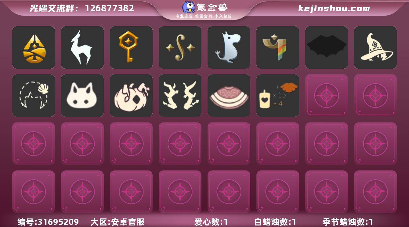 蜡烛数量:2437 爱心数量:400 季节蜡烛数量:47 翼数量:218 归巢季,筑巢季,二重奏季,姆明季,青鸟季,双星季 暮土队伍斗篷,霞谷队伍斗篷,雨林队伍斗篷,云野队伍斗篷,双星季毕业斗篷,青鸟毕业斗篷,青鸟占卜智慧斗篷,青鸟怀旧火花斗篷,青鸟尊贵蓬头斗篷,半边围巾斗篷,姆明季·斗篷,筑巢季·斗篷,紫金流苏斗篷,红绒斗篷,白绒斗篷,粉色花瓣斗篷,黑金,白金,红金,绿芽,圣诞斗,海洋斗,彩虹斗,樱花斗 禁阁指甲盖发型,平菇发型,雨妈发型,海牛发型,士兵发型,头盔发型,温柔的玩具匠发型,青鸟盛装彩纸发型,郡主发型,健忘兔子发型,帽匠绅士发型,侠客头,公主头,公主,蝴蝶结,正太,书虫,高马尾,粗辫,虚荣,花环,若笠,明制,樱花,猫耳,绒帽 巧手隐士长裙,士兵裤子,温柔的玩具匠长裙,严厉的牧牛人长裙,蛇年裤子,筑巢季·裤子,僧袍,姆明季·裤子,妮妮裙子,透明裤子,工装裤,白棉裤,搓澡巾,灯笼裤,邮差裤,雪人裤,背带裤,彩虹裤,猫猫裤 胡子面具,严厉的牧牛人面具,青鸟盛装彩纸面具,单边眼罩,彩虹面具,老头面具,狮子头面具,白鸟面具,啄人面具,小胡子面具,大胡子面具,红狐狸,黄鼠狼,矮人面具,黑脸 迁徙钟匠眼镜,必胜客联动面饰,飘带耳坠,肯德基联动眼镜,青鸟占卜智慧面饰,青鸟毕业面饰 冰晶滑雪板,锦标赛领奖台,暮土队伍旗帜,霞谷队伍旗帜,雨林队伍旗帜,云野队伍旗帜 圆顶帽,网纱礼帽,枯叶发饰,迁徙水母者发饰,迁徙引蝶人触须,蓝色荧光光环,青鸟尊贵蓬头耳机,青鸟怀旧火花发饰,青鸟盛装彩纸发饰,樱花头饰,红色耳机,小红花 双星季项链,青鸟毕业项链,欧若拉季节项链,黑色领巾,姆明季围巾,粉色蝴蝶结,海螺项链,圣诞领结 刀疤士兵鞋子,青鸟伐木不舍鞋子,人字拖,姆明季·鞋子,万圣鞋,芭蕾鞋 粽子发饰礼包,彩虹武士裤,史力奇帽子,牛仔裤,兔子,猫套,彩虹耳机 卖家说:各大热门复刻都已集齐