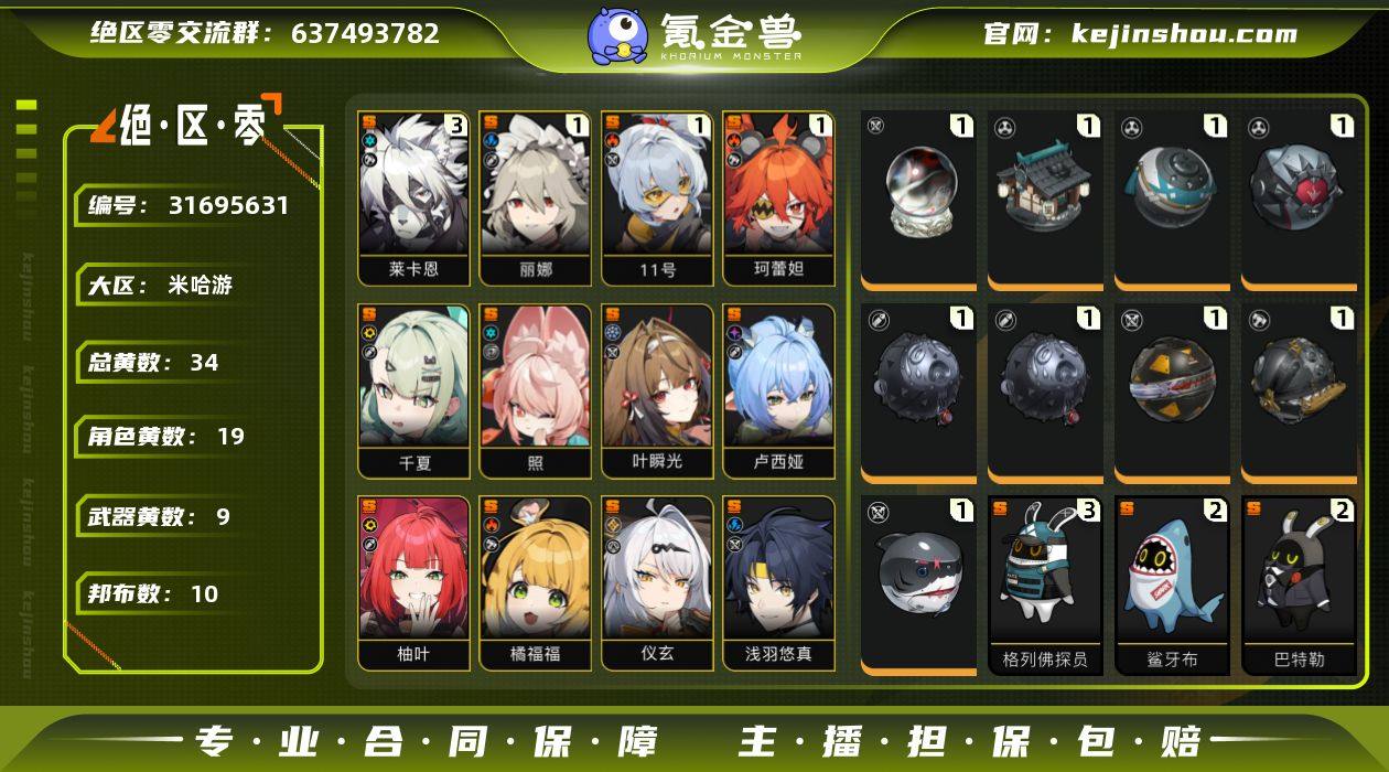 冒险等级:58 总黄数:34 五星角色数:19 菲林底片数量:0 菲林数量:125 加密母带数量:6 3命莱卡恩,1命丽娜,1命「11号」,1命珂蕾妲,0命千夏,0命叶瞬光,0命照,0命卢西娅,0命柚叶,0命橘福福,0命仪玄,0命浅羽悠真,0命星见雅,0命月城柳,0命柏妮思·怀特,0命简,0命艾莲,0命猫又,0命格莉丝 6命潘引壶,6命波可娜,6命赛斯,6命露西,6命苍角,6命派派,6命比利,6命本,6命安比,6命妮可,6命安东,6命可琳,2命真斗 1精云霓孤光,1精霰落星殿,1精时流贤者,1精淬锋钳刺,1精啜泣摇篮,1精硫磺石,1精拘缚者,1精深海访客 3精格列佛探员,2精鲨牙布,2精巴特勒,2精左轮布,1精芽芽,1精艾丝弥小姐,1精狮耶,1精赤红莫库斯,1精阿崔巡查,1精插头布 白心旧影,晴澜双迹套装,漪光夜曲