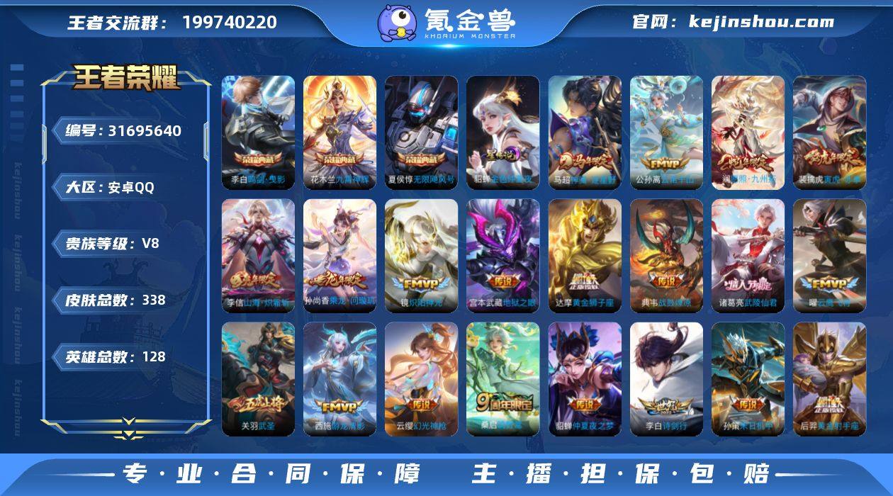 账号亮点:夏侯惇无限飓风号,李白鸣剑曳影,花木兰九霄神辉 马超神骥逐星野,公孙离云诺千山,澜愿照九州拓,云缨幻光神枪,桑启鸣野蒿,典韦战鼓燎原,孙尚香乘龙问璇玑,李信山海炽霜斩,李白诗剑行,孙策末日机甲,裴擒虎寅虎赤拳,西施游龙清影,镜炽阳神光,虞姬启明星使,关羽武圣,曜云鹰飞将,达摩黄金狮子座,后羿黄金射手座,诸葛亮武陵仙君,貂蝉仲夏夜之梦,宫本武藏地狱之眼631 【英雄全皮】:刘邦全皮,苏烈全皮,狂铁全皮,敖隐全皮,金蝉全皮,空空儿全皮 【荣耀典藏】:夏侯惇无限飓风号,李白鸣剑曳影,花木兰九霄神辉 【传说皮肤】:马超神骥逐星野,公孙离云诺千山,澜愿照九州拓,云缨幻光神枪,桑启鸣野蒿,典韦战鼓燎原,孙尚香乘龙问璇玑,李信山海炽霜斩,李白诗剑行,孙策末日机甲,裴擒虎寅虎赤拳,西施游龙清影,镜炽阳神光,虞姬启明星使,关羽武圣,曜云鹰飞将,达摩黄金狮子座,后羿黄金射手座,诸葛亮武陵仙君,貂蝉仲夏夜之梦,宫本武藏地狱之眼 【限定皮肤】:姜子牙天穹之誓,杨戬破阵退雄兵,狄仁杰阴阳师,赵云皇家上将,赵云龙胆,赵云百木心枪,嬴政优雅恋人,孙尚香蔷薇恋人,鲁班七号狮舞东方,庄周高山流水,阿轲迷踪丽影,钟无艳超时空战士,芈月重明,芈月幻夜卜梦,周瑜赤莲之焰,元歌云间偶戏,元歌无心,夏侯惇朔风刀,甄姬落雪兰心,曹操烛龙,典韦穷奇,马可波罗暗影游猎,狄仁杰魔术师,狄仁杰万华元夜,达摩沙漠行僧,项羽海滩派对,老夫子醍醐杖,老夫子航海奇遇记,关羽冰锋战神,关羽武圣,程咬金演武夺筹,刘邦夺宝奇兵,王昭君午后时光,兰陵王驯魔猎人,兰陵王金庭之子,亚瑟潮玩骑士王,孙悟空至尊宝,孙悟空大圣娶亲,牛魔御旌,张飞虎魄,李元芳银河之约,李元芳云中旅人,虞姬启明星使,钟馗神迹守卫,钟馗驱傩正仪,杨玉环遇见飞天,女娲朔望之晖...