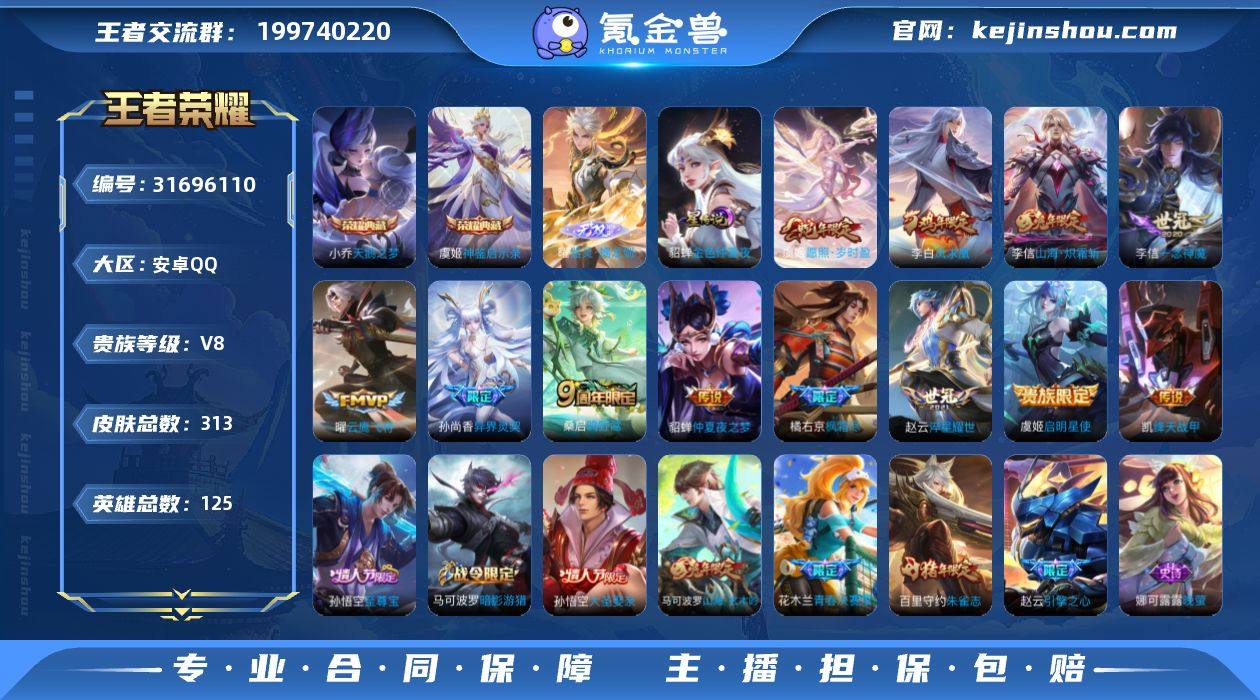 可二次【特价出售/店主推荐】安卓Q-V8-荣耀黄金II段位-126英雄-216皮肤-1典藏皮肤-1无双-1珍品传说-1星传说-19传说-57史诗 【英雄全皮】:达摩全皮,空空儿全皮 【荣耀典藏】:夏侯惇无限飓风号 【无双皮肤】:李信问心剑 【珍品传说】:伽罗沧流箭 【传说皮肤】:关羽神骥镇沧海,后羿神树通天,司空震愿照山河定,澜愿照九州拓,典韦战鼓燎原,曜李逍遥 ,兰陵王默契交锋,诸葛亮时雨天司,铠绛天战甲,镜炽阳神光,虞姬启明星使,关羽武圣,李信一念神魔,貂蝉猫影幻舞,张良黄金白羊座,达摩黄金狮子座,后羿黄金射手座,孙尚香末日机甲,狄仁杰超时空战士 【限定皮肤】:狄仁杰阴阳师,赵云皇家上将,庄周高山流水,高渐离玩趣恶龙,吕布御风骁将,元歌云间偶戏,元歌无心,狄仁杰魔术师,狄仁杰万华元夜,达摩星际陆战队,达摩沙漠行僧,项羽海滩派对,老夫子醍醐杖,关羽武圣,程咬金演武夺筹,王昭君午后时光,兰陵王默契交锋,花木兰默契交锋,亚瑟潮玩骑士王,李元芳云中旅人,虞姬启明星使,钟馗驱傩正仪,干将莫邪冰霜恋舞曲,雅典娜黎明之约,鬼谷子原初探秘者,诸葛亮时雨天司,苏烈千军破阵,沈梦溪大漠名商,明世隐疑决卦,裴擒虎李小龙,裴擒虎擒涛扼浪,狂铁电玩高手,米莱狄胡桃异想国,曜李逍遥 ,鲁班大师探海日志,镜匿光追影者,桑启海盐诗旅,张良古海寻踪,鬼谷子天穹祈灯,刘邦剑破天穹,刘备异域游侠 【年限皮肤】:诸葛亮时雨天司,吕布御风骁将,司空震愿照山河定,澜愿照九州拓 【赛季限定】:明世隐疑决卦,老夫子醍醐杖,鬼谷子原初探秘者,狄仁杰万华元夜,程咬金演武夺筹,钟馗驱傩正仪,苏烈千军破阵,达摩沙漠行僧,沈梦溪大漠名商,李元芳云中旅人,桑启海盐诗旅,裴擒虎擒涛扼浪,鲁班大师探海日志,张良古海寻踪,鬼谷子天穹祈灯,刘邦剑破天穹,太乙真人谧流熔炉,钟馗虚...