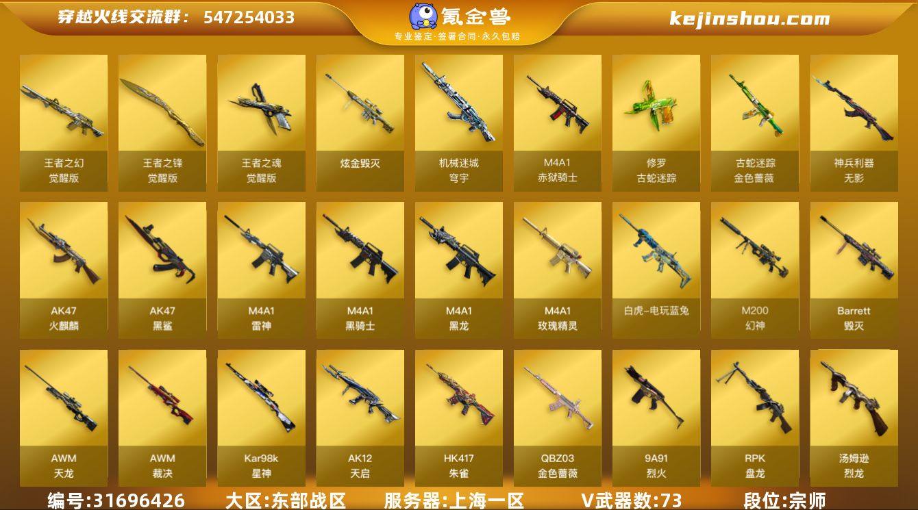 【自带包赔 最高三倍】:东部战区-LV.102-宗师3-上海一区-73V-3王者武器数-1炫金武器数 号里还有53000CF点 【传说武器】:传说暗裔 【热门武器】:Kar98K-星神,M200-幻神,M200-竞技荣光,白虎-电玩蓝兔,HK417-朱雀,M4A1-黑骑士*4,QBZ03-金色蔷薇,RPK-盘龙,沙鹰-修罗,汤姆逊-烈龙,USP-雷暴,金色蔷薇-古蛇迷踪,修罗-古蛇迷踪,雷神-小红,裁决-雪莉杨 【王者炫金武器】:炫金毁灭 【音效卡】:AWM-裁决音效卡,M4A1-黑骑士音效卡,Barrett-毁灭音效卡,Kar98K-星神音效卡 【皮肤】:毁灭-黑大圣皮肤,火麒麟-AG战队皮肤,火麒麟-百城,火麒麟-心动糖果,毁灭-暗月,黑骑士-暗月,雷神-宇航兔皮肤,M200-幻神-黄忠皮肤,无影耀金皮肤,无影-霓裳皮肤,AWM-裁决-百城联赛天津皮肤,裁决-羽掣 皮肤,雷神-暗月,火麒麟-雷神,毁灭-魔灵皮肤,毁灭-英雄计划 皮肤,黑龙-能量核心,天启-暗月,战神-紫绶金章皮肤*5,战神-流金岁月皮肤*3,AK47-B-常胜将军-刘备 【角色】:电竞教官-云悠悠,零,女主播,青霞仙子,蜀雪,铁骑荣耀,王者-瞳-闭月羞花,蛇隐宗,奇洋探员,乔伊教练,修道士,云海玲珑,暗夜-X,初恋灵狐,虎妞,嘉年华灵狐,灵狐者-七夕宝贝,曼陀罗-礼服,潜龙队-X,蛇姬,斯沃特-X,维纳斯,雪莉杨,雪莉杨-摸金校尉,影武者-X,智影 【人偶武器】:AWM-灵狐-15周年嘉年华*2,夺魂,迷你深渊冰龙,迷你裂空之翼,迷你波特博士*3,迷你火种*4,迷你艾比,迷你超能女侍,生化手雷-机甲核心,闪光弹-小乔,雷神-小红,裁决-雪莉杨,街机小灰机 【挑战大师】:冰龙粉碎者-白马银枪*2,惩戒者III,激光毁灭者III-白马银枪*2,神圣爆裂者-末日III 【英雄级武器】:AK47-火麒麟*2,AK12-天启*2,AK47-黑鲨,AWM-天龙,AWM-裁决,Barrett-毁灭,Kar98K-星神,柯尔特-竞技荣光,龙啸,M4A1-...