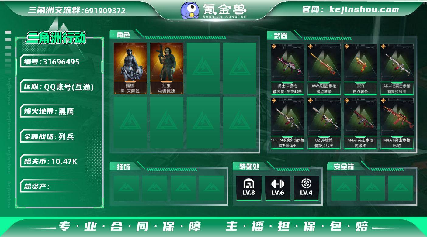 总资产356M【红皮露娜 40颗AW子弹】哈夫币10,473K,行动等级:60,干员红皮数量:1,仓库等级:8级,训练中心等级:6级,靶场等级:4级,干员皮肤:2,枪皮:168 【近战武器】 黑鹰 【干员皮肤】 露娜-黑·天际线 红狼-电锯惊魂 【传说挂饰】 黑 火箭玫瑰 能天使 赤霄游龙 【载具】 防空车-赤色军团 步战车-几何碎片 步战车-生命线 防空车-生命线 轮式突击炮-护林人 M1A4坦克-哈夫克重工 全地形车-森林迷彩 【其他典藏】 PKM通用机枪-旧工业 R93狙击步枪-猛兽 AK-12突击步枪-青纹 R93狙击步枪-常青藤 M700狙击步枪-蝴蝶 AK-12突击步枪-旧工业 【枪皮】 M4A1突击步枪-高雅黑 QBZ95-1突击步枪-高雅黑 G3战斗步枪-高雅黑 AK-12突击步枪-落花 QBZ95-1突击步枪-曙光 M4A1突击步枪-海色 QBZ95-1突击步枪-海色 SCAR-H战斗步枪-童趣 AUG突击步枪-蝮蛇 SCAR-H战斗步枪-荣耀列队 M16A4突击步枪-山林猎人 PTR-32突击步枪-黄蜂 PTR-32突击步枪-天网 AK-12突击步枪-特斯拉线圈 QBZ191突击步枪-突击步枪-捞点薯条 AKM突击步枪-林中猎手 M16A4突击步枪-竞赛选手 SG552突击步枪-深海恐惧 SCAR-H战斗步枪-囚徒 CAR-15突击步枪-阿米娅 M4A1突击步枪-阿米娅 Scar-H突击步枪-水墨云图 PTR-32突击步枪-英雄 SR-3M紧凑突击步枪-三角洲力量 QBZ191突击步枪-三角洲力量 SG552突击步枪-海浪 QBZ95-1突击步枪-海浪 K416突击步枪-酷炫狂拽 CAR-15突击步枪-前沿科技 SCAR-H战斗步枪-数码迷彩 M4A1突击步枪-粉色涂装 M16A4突击步枪-三角洲力量 SCAR-H战斗步枪-红色涂装 M7战斗步枪-红色涂装 AUG突击步枪-浅蓝涂装 K416突击步枪-几何迷彩 K416突击步枪-高雅黑 M700狙击步枪-竞技风 SVD狙击步枪-阿萨拉工艺 M700狙击步枪-蝮蛇 SV-98狙击步枪