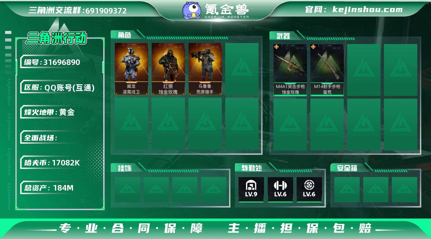 "YXB-17082k哈伏币-总资产184m流动资产136m-60烽火等级-黄金-1战场等级-无军衔 【干员外观】:红狼-蚀金玫瑰,威龙-凌霄戍卫,乌鲁鲁-荒原猎手 【近战皮肤】:近战-黑鹰 【特勤处】:仓库9--训中6-靶场6 部门22322 【传说外观】:M4A1突击步枪-蚀金玫瑰,M14射手步枪-蛮荒 【史诗外观】:K416突击步枪-冬日风情,K416突击步枪-腊梅,腾龙突击步枪-猎鳄行动,PKM通用机枪-阿萨拉特攻,M249轻机枪-丛影谍踪,VSS射手步枪-丛影谍踪,M14射手步枪-工业狂潮,M700狙击步枪-蝮蛇"