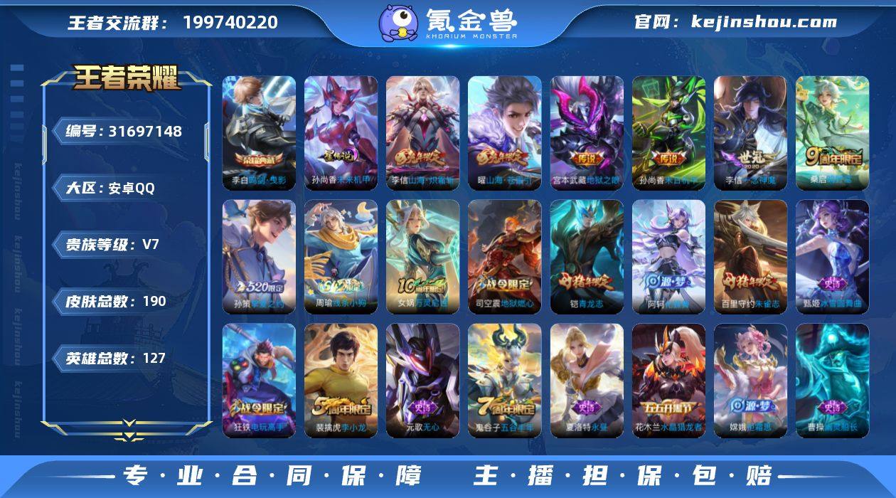 贵族7,190皮肤,最高段位王者,现段位钻石二。53个限定包括传说限定和史诗限定,可单独找我砍价,可当小号练