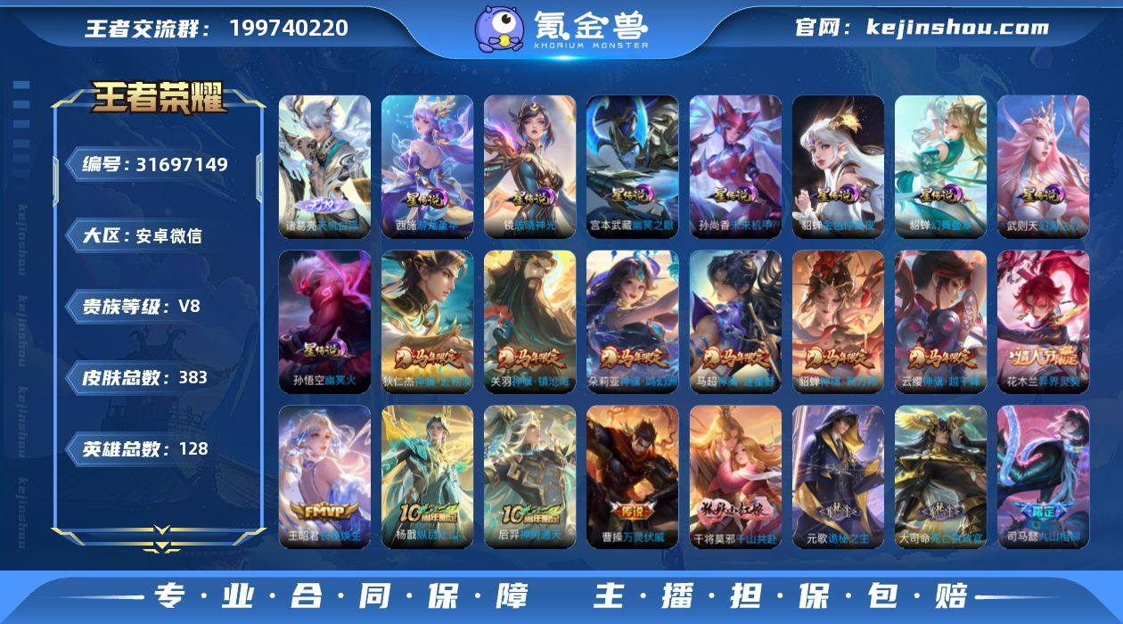 贵族等级:V8 典藏皮肤数:0 珍品无双皮肤数:0 无双皮肤数:1 珍品传说皮肤数:0 传说皮肤数:50 史诗皮肤数:111 皮肤数:383 英雄数:128 段位:非凡王者 卖家说:11000孙悟空1万分杨玉环戈娅金标莱西奥 新版战令赛事已开背包已有一颗荣耀水只要是玩了基本都是荣耀百星亮点很多账号很安全的