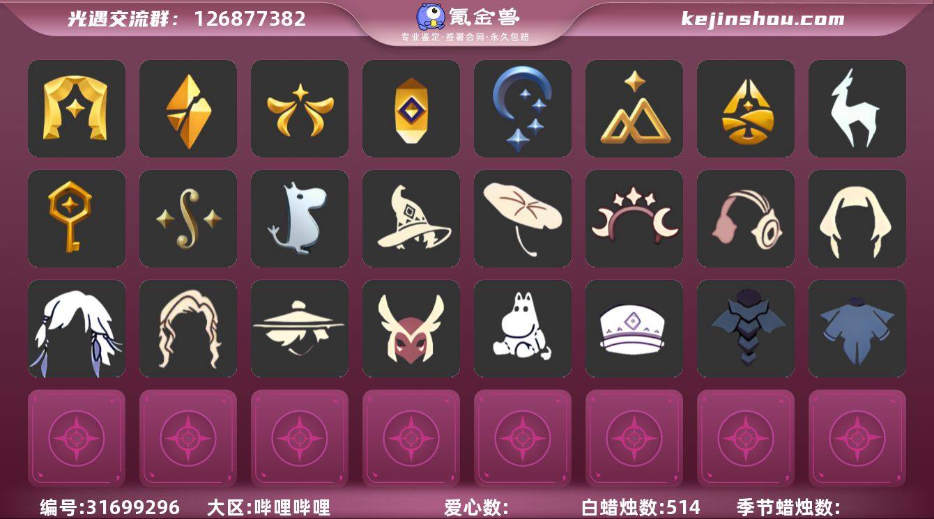 账号类型: 手机账号 季节已毕业: 破晓季,欧若拉季,夜行季,追忆季,拾光季,归巢季,九色鹿季,筑巢季,二重奏季,姆明季,彩染季,青鸟季,双星季 完成地图: 晨岛,云野,雨林,霞谷,暮土,禁阁 珍稀物品: 透明蝶翼斗,彩虹围巾 礼包: 蝙蝠套,巫师,围巾,星球斗,小狐狸,欧若拉之翼,九色鹿角,莲花斗,大耳狗抱枕,大耳狗装扮,绊爱,鹿角,荷叶伞,蜘蛛斗,兔子鞋,大耳狗发饰,运动鞋,茶桌,白绒金,瑞雪,福娃,小船,灯笼,致爱装扮,人声乐器,奔跑发型,橘子,贝壳,黄伞,红伞,兔子,水母,星月头饰,彩虹耳钉,新年裤,奥利奥,小提琴,爱心眼镜,火焰眼镜,透明蛛丝,创始人,飞鸟纸伞,锦标赛桂冠,姆明饰品套装,妮妮斗篷,衔福献瑞礼包,献瑞折扇礼包,心心相印发饰礼包,小狗周年发饰,奉献斗篷,青衫落拓礼包,线框斗篷礼包 裤子: 武士裤,背带裤,击剑裤,妮妮裙子,蓝绿裤,飞天裤,筑巢季·裤子,青鸟尊贵蓬头裤子 面具: 夜行毕业面具,辉光羚羊面具 面饰: 红耳机,黑框眼镜,青鸟毕业面饰 项链: 围巾 发型: 归巢毕业发型,若笠,虚荣,留辫蘑菇头,飞天盘发 头饰: 牛仔帽,平顶帽 斗篷: 海洋斗,绿芽,粉红绒毛斗篷,遥鲲斗篷,冥龙斗篷,彩染围巾斗篷,奉献斗篷,青鸟毕业斗篷 配饰: 雨伞,筑巢季·小手办,高音钢琴,姆明抱枕,小红伞,相机,二重奏挂画,鲲灯 亮点: 【优质装备】:武士裤,破晓季,透明蝶翼斗,欧若拉季(欧若拉),归巢毕业发型(五塑彩羽发),筑巢季·小手办(光之子试衣),高音钢琴(白色高脚钢琴),夜行季,追忆季,妮妮裙子(妮妮长裙),牛仔帽(西部帽),姆明抱枕,小红伞(姆明红伞)(姆明大伞),相机(季卡相机),拾光季,彩虹围巾(五塑彩带斗),归巢季,九色鹿(九色鹿季),蓝绿裤(高领舞服),飞天裤(柔缎花边连)(九色鹿丝带裤),围巾(肩带),筑巢季,蝙蝠套(蝙蝠斗篷)(南瓜头),星球斗(星球夹克),欧若拉之翼,福娃(福娃礼包)(春之日礼包)(铜钱斗),莲花斗(异彩莲花斗篷),绊爱(绊爱斗篷)(绊爱礼包),茶...