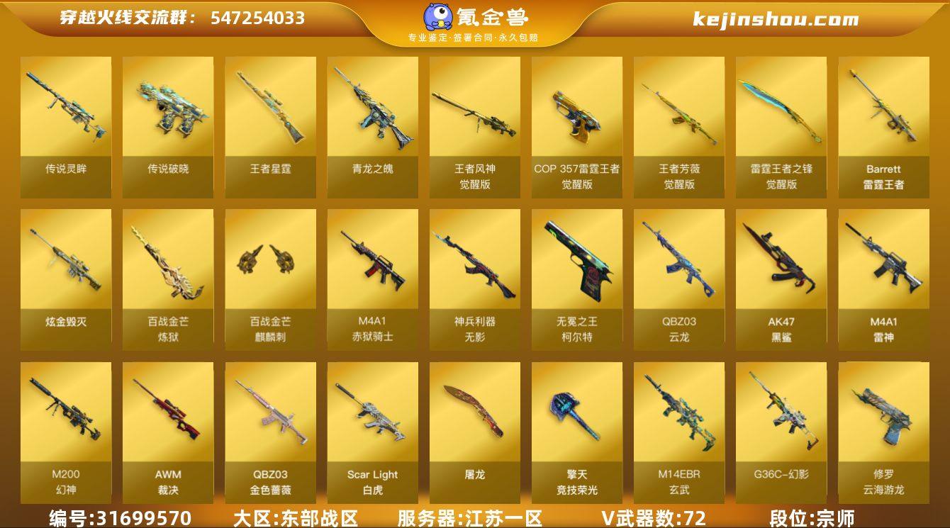 【自带包赔 最高三倍】:东部战区-LV.100-宗师3-江苏一区-72V-28王者武器数-1炫金武器数 【传说武器】:传说灵眸,传说破晓 【传说角色】:传说影煞 【热门武器】:M200-幻神,Kar98K-星神,G36C-幻影,Scar Light-白虎,QBZ03-金色蔷薇,炽芒蝶刃*2,Cat-刀锋,M14EBR-玄武,青龙之魄,荣耀世冠-龙啸,MK5-炽火炎龙,羊驼玩偶 【王者炫金武器】:青龙之魄,王者星霆,炫金毁灭,Barrett-雷霆王者 【音效卡】:QBZ03-金色蔷薇音效卡,Kar98K-星神音效卡,Scar Light-白虎-热带奇洋音效卡,Barrett-碧霄极光音效卡,炼狱-百战金芒-庆典舞曲音效卡,AWM-昌龙-怀旧音效卡 【皮肤】:幻神-宠儿-2021MVP,幻神-CFS2022,幻神-动感闪耀 皮肤,幻神-电流骇客 皮肤,毁灭-CFS2020,雷神-荣耀之魄,雷神-宠儿-2019MVP,Scar Light-白虎-暗星,屠龙-星火燎原,QBZ03-CFS2024 皮肤,裁决-流光秘银,Kar98K-星神-AG-CFPLS21冠军皮肤,雷神-梦蝶 皮肤,M4A1-再燃火线,雷神-神秘按键 皮肤,毁灭-梦蝶 皮肤,屠龙-星耀 皮肤,轻型军用手斧-再燃火线 【角色】:电竞教官-云悠悠,灵动武士,蜀雪,王者炫,华,战地猎狐,奇洋探员,暗夜-X,初恋灵狐,芳心审判者,飞虎队-X,风暴女,嘉年华灵狐,曼陀罗-X,斯沃特-X,雪莉杨-摸金校尉,游珑儿,智影 【人偶武器】:AWM-灵狐-15周年嘉年华,Barrett-夜玫瑰,Cat-刀锋,M4A1-蓝水晶-斯沃特精英,迷你牛牛,星神-炽天使,MK5-炽火炎龙,Scar Light-马枪,街机小灰机,QBZ03-斯沃特 【挑战大师】:冰龙粉碎者-白马银枪*3,激光毁灭者III-白马银枪*2 【英雄级武器】:AK47-黑鲨,AWM-裁决,炽芒蝶刃*2,Kar98K-星神,M4A1-雷神,M200-幻神,擎天-竞技荣光,荣耀世冠-龙啸,沙鹰-天神*2,屠龙,Scar Light-白虎,M14EBR-玄武,无影-神兵利器,G36C-幻影,QBZ03-云龙,黑武士-...