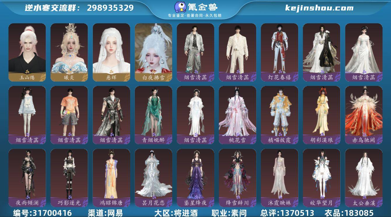 网易支付状态:可注销 换绑冷却:有冷却 职业:素问 总评:1370513 衣品:183085 玉山绻,曦炎,悬辉 白夜拂雪 灯花春禧,幻核星芒,皓律星芒,海盐甜梦,龙阙惊鸿,梦羽凝弦,甜宙漫游,星弈玄夜,青烟妩醉,烟雪清菡,橘喵披霞,桃花雪,赤乌驰阙,胡彩漠琅,巧影逐光,夜雨倾澜,鸿昭锦唐,昙月花恋,鎏星绛夜,绛雪辞川,沐霞映姝,皎华望月,太公垂溪,盛浪晴海,云锦天香,雪团云绒,焦糖暖绒,楚念良时,怡红顽玉,青羽惊梦,鹅糯多姿,幽蝶魅影,云绣露华,音律织光,碎玉怜姻,惜金纳缘,幽梦逢她,追鱼思渊,洛神芳蔼,海月漫歌,山青见雨,曦凤嘉煌,血宴风华,墨山烟霏,鸿福昭运,丹橘织雪,灵娲泽生,岁鳞衔新,珊枝琢浪,朝歌旧梦,飞叶若依,灵珠饮月,灵珠海羽,凤亭疏香,白夜俘获,不负卿愿,难负君思,云汉逢夕,空冥铃语,绛英流芳,芳汀花影,星迹梦语,琅霄吟月,悬蛛结心,狸奴颂锦,玉蕊含梅,幽兰沐月,凤吟振羽,灼金喵影,律动音阶,蝎影度月,跃动心芒,晶梦绮舞,恣行无拘,花萼繁舞,灵语星彩,丹枫秋意,四海无拘,谁家新燕,烟黛粉墨,茸客衔春,竹间萌客,糯粽缠青,锦尾芊芊,宅宅乐,苏韵流芳,鲤跃今宵,开阳执戈,紫微御宵,蓬海泷音,蓬海沧歌,兰亭觞咏,贪狼摄星,衣香鬓影,逆鳞濯月,曦照东晖,灵兔献瑞,玄喵夜行,瑞云舒华,鳞纱幻海,赤狐魅语,白灵雪魅,墨隐千秋,无常白袍,聆萤语,圣月澄空,似水幽华,鸢染烟纱,天狼北顾,白露惑心,金角玄鉴,银角辟幽,清露漱雨,素尘凌霜,枫华九霄 奶绒豹豹,骋风叱焰,踏春遥,辞墨声,空山闲,逍遥游,兆丰年,木小马 卖家说:还有剩余新时装没填,价格可商议