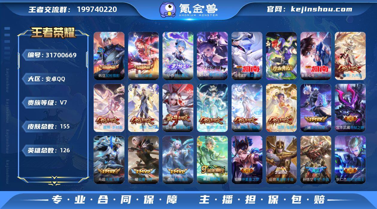 【4584】安卓Q-V7-至尊星耀V段位-126英雄-155皮肤-2典藏皮肤-1无双-4珍品传说-19传说-43史诗 【荣耀典藏】:韩信弑枪猎影,瑶拾光映像 【无双皮肤】:小乔时之魔女 【珍品传说】:马可波罗怪盗基德,鲁班七号江户川柯南,孙策时之奇旅,安琪拉酷洛米之心 【传说皮肤】:司空震愿照山河定,女娲愿照千秋盛,妲己愿照众生和,澜愿照九州拓,蔡文姬愿照福禄聚,虞姬愿照岁时盈,桑启鸣野蒿,澜逐花归海,马超无双飞将,西施游龙清影,公孙离祈雪灵祝,虞姬启明星使,孙悟空零号赤焰,曜云鹰飞将,张良黄金白羊座,后羿黄金射手座,貂蝉仲夏夜之梦,宫本武藏地狱之眼,狄仁杰超时空战士 【限定皮肤】:姜子牙天穹之誓,狄仁杰阴阳师,赵云皇家上将,妲己时之彼端,高渐离玩趣恶龙,狄仁杰魔术师,项羽海滩派对,老夫子醍醐杖,孙悟空至尊宝,孙悟空零号赤焰,李元芳银河之约,李元芳云中旅人,虞姬启明星使,蔡文姬繁星吟游,鬼谷子原初探秘者,苏烈千军破阵,公孙离祈雪灵祝,沈梦溪大漠名商,明世隐疑决卦,裴擒虎李小龙,狂铁电玩高手,云中君纤云弄巧,盘古冰霜神祇,桑启海盐诗旅,小乔时之魔女,沈梦溪龙舞盛年 【年限皮肤】:公孙离祈雪灵祝,司空震愿照山河定,女娲愿照千秋盛,妲己愿照众生和,澜愿照九州拓,蔡文姬愿照福禄聚,虞姬愿照岁时盈 【赛季限定】:明世隐疑决卦,老夫子醍醐杖,鬼谷子原初探秘者,苏烈千军破阵,沈梦溪大漠名商,李元芳云中旅人,桑启海盐诗旅,姜子牙天穹之誓,东皇太一噬灭天穹,太乙真人谧流熔炉,钟馗虚灵犬护,亚瑟荣光之誓 【战令限定】:李元芳银河之约,狂铁电玩高手,亚连破空之剑,廉颇撼地雄心,孙悟空神迹守卫,百里守约百相守梦,老夫子百相守梦,刘禅鸭鸭历险记,沈梦溪鸭鸭历险记,周瑜线条小狗 【史诗皮肤】:鲁班七号电玩小子,露娜紫霞仙子,阿轲暗夜猫娘,赵...