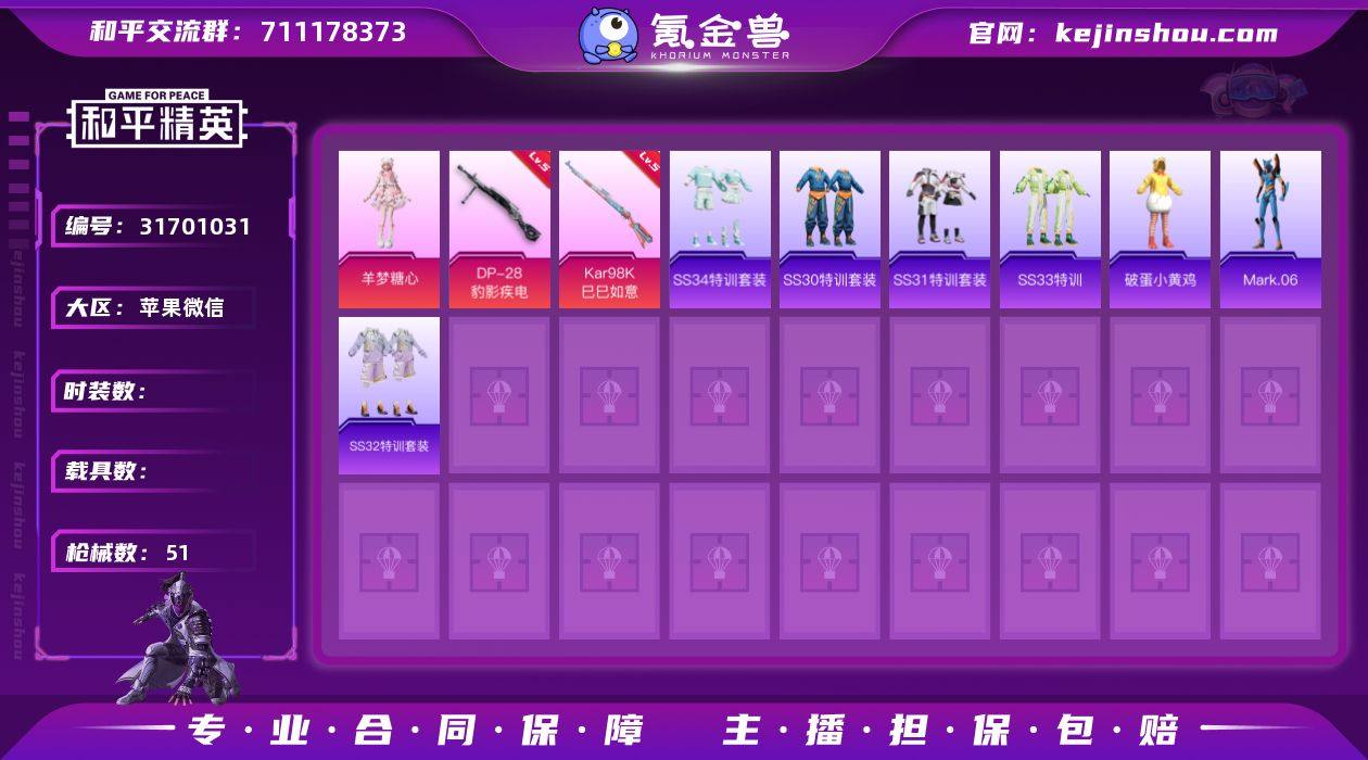 实名:可二次实名 是否支持人脸包赔:支持 粉装数量:3 特效枪数量:8 时装数:591 枪械数:195 彩虹甜喵,呆萌星弥,绯穹魔姬 七级AKS-74U-星穹咏叹调,六级M249-绝对恒星,五级MK14-福马献瑞,五级DP-28-豹影疾电,五级Kar98K-巳巳如意,四级破片手榴弹-招财进宝,四级UMP45-萌骑冒险,一级信号枪-金乌曜日 狙击之神,马上来财,福马献瑞,红釉青花,SS37特训,雨过天青,青翼流星,月烬之祷,阳光菠萝,雪国风尚,超能元气,画境星梦,琴音绮想,书海巡游,SS36特训,炫彩糖果,粉黛兰香,绯色魅影,萌鸡速递,紫俏灵猫,风迹短诗,秘语星愿,SS35特训,午间小调,超感刻度,甜心蒙太奇,元气之梦,漫游都市,薄荷星砂,云魄琉璃,狂鲨锋刃,凌霄紫焰,擎苍青焰,SS34特训套装,游乐,朱霞炽焰,暗黑骑手,暗夜傀儡,冰冻风暴,缤纷果语,滨海厨神,冰河战士,白糯汤圆,白色伏地魔,彩虹兔,长空猛禽,超能勇士,顶瓜瓜,蝶变,大橘大利,都市魅力,福星高照,格斗先锋,龟仙人,光之冒险,混沌火种,海岛探路者,鹤鸣,湖蓝色名流,幻世保卫者,黑色伏地魔,黄色伏地魔,黄色名流,黄色运动,红色运动,幻世战舞者,幻影武者,晶辉守护,酒红色名流,橘黑制服,竞技达人朋克,竞技名士,吉莉礼服,极速红龙,街头潮人,街头风暴,绛羽幽主,酷潮明星,空岛之星,蓝彩潮人,龙的传人,龙魂突击队,猎鹰,蓝色守护者,蓝色运动,莱茵河畔,恋语绒绒,冷焰舞者,漫步者,猛禽,萌黄之夏,魅力单车,麻辣教官,玫纹锢梦,霓虹街区,柠萌假日,牛气满满,破蛋小黄鸡,破晓战魂,绮丽涂鸦,青年教官,青涩时光,骑行爱好者,千禧之恋,云朵鹅,人气偶像,深蓝色名流,沙漠兵团,SS16特训,SS17特训,SS18特训,SS19特训,SS20特训,SS21特训,SS22特训,SS23特训,SS24特训,SS25特训,SS26特训,SS27特训,SS28特训,SS29特训,SS31特训套装,SS32特训套装,SS33特训套装,巳巳如意,探宝勇士,甜蜜告白,涂山之恋,特训学院,完美偶像,王牌教练,迅捷狂鲨,雪绒豹,旭日情侣,香桃花海,星途旅人,耀粉歌者,鹰眼刺客,异域银装,战地督导,智谋强哥,灼焰舞者 炫彩糖果飞行器,罪夜之冕降落伞,绝对恒星降落伞,极意拳锋降落伞,炫彩糖果降落伞,异瞳寒姬降落伞,喜羊羊与灰太狼降落伞,绯月迷踪降落伞,冷漠罗丽降落伞,星梦奇缘降落伞 卖家说:有50天特权卡手枪打了58