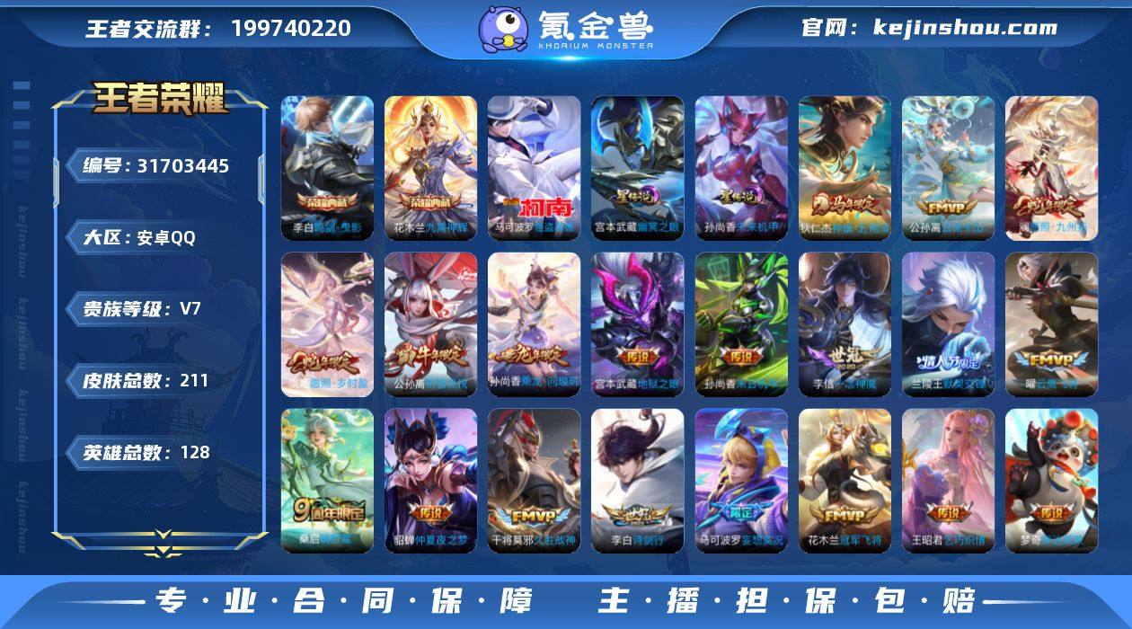 贵族等级:V7 典藏皮肤数:2 珍品无双皮肤数:0 无双皮肤数:0 珍品传说皮肤数:1 传说皮肤数:20 史诗皮肤数:65 皮肤数:211 英雄数:128 段位:非凡王者 卖家说:退游了,低价出。