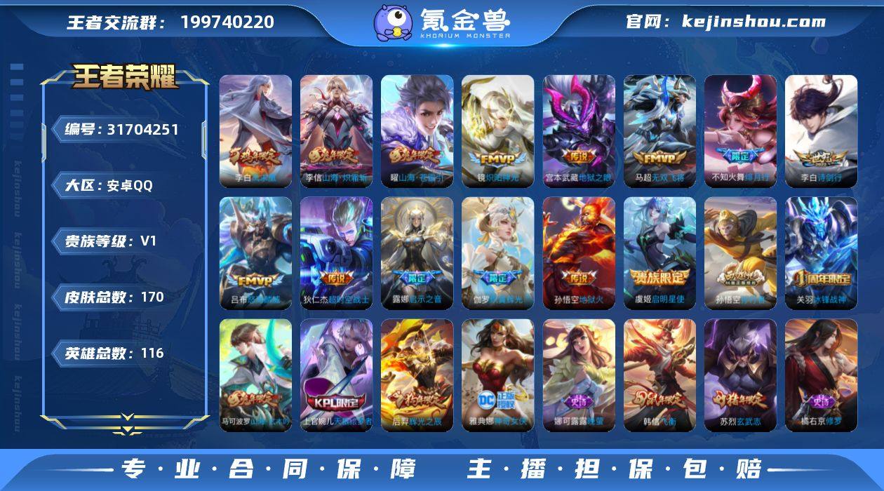 【XY100】贵族0/皮肤170/传说14/史诗39/英雄116/炽翼辉光/山海·苍雷引/山海·炽霜斩/怒海麟威/诗剑行/绯月行/无双飞将/启示之音/炽阳神光/启明星使/凤求凰/地狱之眼/地狱火/超时空战士-狄仁杰/狰(s8)/阴阳师/皇家上将/狮舞东方/死亡摇滚/超时空战士-钟无艳/夜都怪侠/重明(s11)/无心/朔风刀(s17)/落雪兰心/烛龙(s10)/穷奇(s12)/山海·玄木吟/魔术师/万华元夜(s22)/沙漠行僧(s26)/海滩派对/醍醐杖(s20)/冰锋战神/演武夺筹(s23)/逐梦之影/飞衡/金庭之子(s27)/孙行者/御旌(s15)/辉光之辰/云中旅人(s29)/神迹守卫-钟馗/驱傩正仪(s24)/饕餮(s9)/原初探秘者(s21)/五谷丰年/玄武志/千军破阵(s25)/混沌棋(s18)/大漠名商(s28)/疑决卦(s19)/吟游魔法/御狮(s13)/御霄(s14)/御銮(s16)/天狼绘梦者/暖冬·兔眠/海盐诗旅(s30)/星界游侠/暗夜猫娘/未来纪元-赵云/鬼剑武藏/水果甜心/魅力维加斯/千年之狐/末日机甲-吕布/白龙吟/水晶猎龙者/暗隐猎兽者/黄金分割率/心灵骇客/曙光守护者/节奏热浪/猫狗日记-孙策/鹰眼统帅/晚萤/修罗/热力回旋/暗渊魔法/永昼/赏金猎手/唤灵魅影/教廷特使/街头霸王/哥特玫瑰/大发明家/忍·炎影/红桃皇后/白色死神/化身博士/天使之翼/少女阿狸/黄金武士/死亡骑士/拳王/五福同心/花好人间/万事如意/万象初新/纽约教父/龙腾万里/进击墨子号/海滩丽影/霸王丸/功夫老勺/沉稳之力/掌控之力/敏锐之力/如懿/丁香结/野性能量/神迹守卫/归虚梦演-蒙犽/炽热元素使/次元突破/特工战影/秘密基地/缤纷绘卷/无双福将/契约魔法/胡桃狂想曲/蔚蓝守将/危途狂花/潮玩造梦师/幻泉雾影-海月/牛运亨通/神奇女侠/福禄兄弟/金属狂潮/绯红之刃/异域舞娘/剑舞者/潮流仙人/精灵公主/锦衣卫/万圣前夜/西部大镖客-孙悟空/海军大将/精灵王/范海辛/特种部队/加勒比小姐/蔷薇王座/战争骑士/战争女神/激情绿茵/维京掠夺者/三太子/芝加哥教父/伊势...