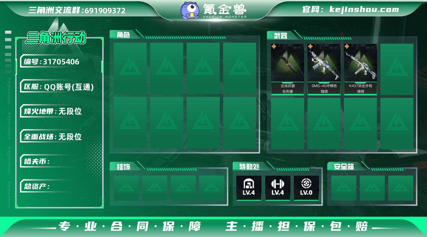 hf13724总资产456m纯币438m+处刑者刀+锦绣全套+烽火等级60+特勤部门等级可以+永久包赔