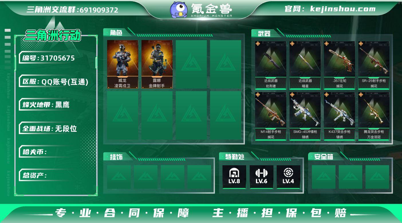 hf13722总资产300m纯币83m+s8赛季3x3安全箱+凌霄戍卫全套+处刑者刀+暗星全套+鹅鸭杀全套+锦绣全套+万金泪冠全套+缄花全套+s7s8赛季通行证+烽火等级60+特勤部门等级可以+守信不予+永久包赔