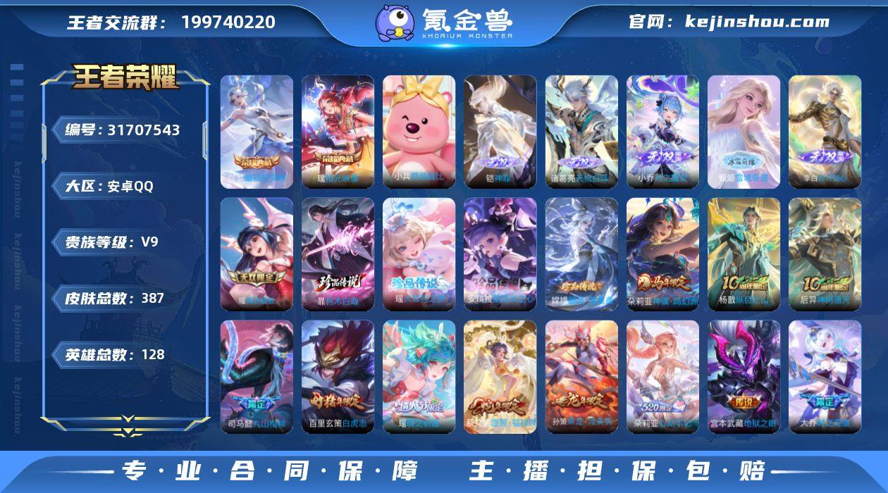 贵族等级:V9 典藏皮肤数:2 珍品无双皮肤数:0 无双皮肤数:6 珍品传说皮肤数:4 传说皮肤数:22 史诗皮肤数:124 皮肤数:387 英雄数:128 段位:王者