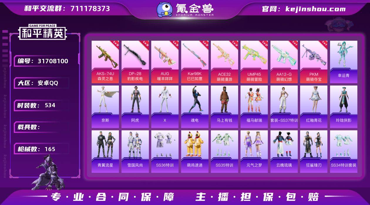 实名:可二次实名 是否支持人脸包赔:支持 特效枪数量:8 时装数:534 枪械数:165 五级AKS-74U-森灵之息,五级DP-28-豹影疾电,五级AUG-暖羊咩咩,五级Kar98K-巳巳如意,三级ACE32-萌骑漫游,二级UMP45-萌骑冒险,一级AA12-G-萌骑幻想,一级PKM-萌骑夺宝 狙击之神,阿虎,魂电,马上有钱,奈斯,X,幸运青,福马献瑞,红釉青花,SS37特训,雨过天青,玲珑侠影,青翼流星,雪国风尚,SS36特训,萌鸡速递,SS35特训,元气之梦,云魄琉璃,狂鲨锋刃,SS34特训套装,暗黑骑手,冰川特警,冰冻风暴,缤纷果语,滨海厨神,滨海假日,冰河战士,白糯汤圆,白色伏地魔,长空猛禽,潮流炫酷,大橘大利,都市魅力,飞驰魅影,疯狂小兔子,福星高照,龟仙人,海岛探路者,鹤鸣,虎虎生威吉莉,湖蓝色名流,怀庆长公主,黑色伏地魔,黄色伏地魔,黄色名流,黄色运动,红色运动,幻影公爵,幻影武者,酒红色名流,橘黑制服,竞技达人朋克,竞技名士,极速光影,极速红龙,街头潮人,街头风暴,空岛之星,空投萌叽,蓝彩潮人,猎鹰,蓝色守护者,蓝色运动,恋语绒绒,冷焰舞者,漫步者,猛禽,魅力单车,麻辣教官,萌趣颜团子,明鸳圣池,霓虹极客,霓虹街区,柠萌假日,牛气冲天,牛气满满,破蛋小黄鸡,破晓战魂,情公主,绮丽涂鸦,青年教官,青涩时光,瑞龙福将,人气偶像,深蓝色名流,森林游猎者,SS13特训,SS14特训,SS15特训,SS16特训,SS17特训,SS18特训,SS19特训,SS20特训,SS21特训,SS22特训,SS23特训,SS24特训,SS26特训,SS27特训,SS28特训,SS30特训套装,SS31特训套装,SS32特训套装,SS33特训套装,巳巳如意,甜蜜熊情侣,特训学院,团圆交子,特种颜团子,特战装甲,完美偶像,王牌教练,旭日情侣,夏日音浪,香桃花海,星途旅人,雪鹰学院,异彩先驱,耀粉歌者,音速流光,玉兔迎春,鹰眼刺客,鱼渊荷华,燕燕于飞,异域银装,战地督导,智谋强哥,灼焰舞者 月影灵韵降落伞 卖家说:可小刀屠龙刀别来