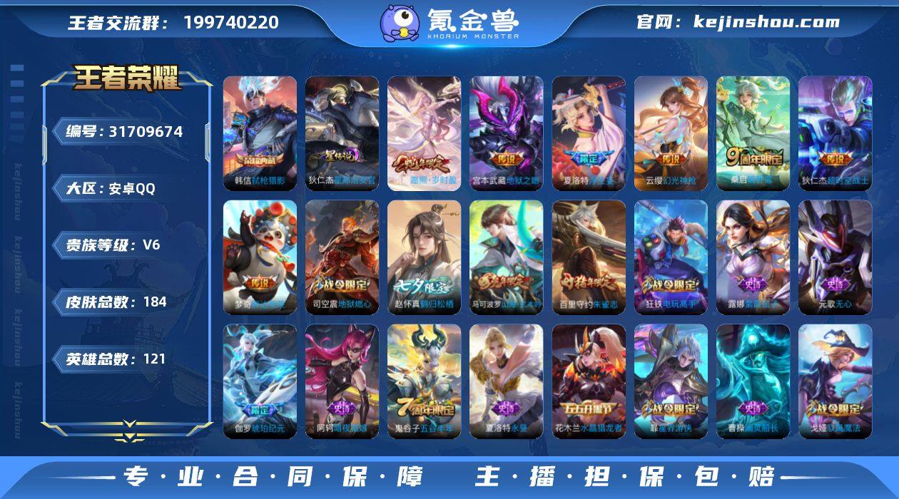 安卓Q-V6-最强王者段位-123英雄-160皮肤-1典藏皮肤-2传说-35史诗 【荣耀典藏】:孙悟空全息碎影 【传说皮肤】:桑启鸣野蒿,铠琥珀纪元 【限定皮肤】:蔡文姬夏日便利店,虞姬夏日便利店,姜子牙天穹之誓,狄仁杰阴阳师,赵云皇家上将,庄周高山流水,高渐离玩趣恶龙,甄姬游园惊梦,狄仁杰魔术师,狄仁杰万华元夜,达摩沙漠行僧,项羽海滩派对,老夫子醍醐杖,程咬金演武夺筹,兰陵王金庭之子,李元芳云中旅人,钟馗驱傩正仪,鬼谷子原初探秘者,鬼谷子五谷丰年,苏烈千军破阵,沈梦溪大漠名商,裴擒虎擒涛扼浪,云中君纤云弄巧,鲁班大师探海日志,桑启海盐诗旅,张良古海寻踪,高渐离燃音魔法,妲己灵卜魔法,鬼谷子天穹祈灯,铠琥珀纪元,沈梦溪龙舞盛年,鲁班七号蔬乡物语,李元芳蔬乡物语,刘邦剑破天穹,程咬金群星魔术团,周瑜熔金海岸 【赛季限定】:狄仁杰万华元夜,达摩沙漠行僧,老夫子醍醐杖,程咬金演武夺筹,兰陵王金庭之子,张良古海寻踪,李元芳云中旅人,钟馗驱傩正仪,鬼谷子原初探秘者,苏烈千军破阵,沈梦溪大漠名商,裴擒虎擒涛扼浪,鲁班大师探海日志,桑启海盐诗旅,鬼谷子天穹祈灯,刘邦剑破天穹,姜子牙天穹之誓 【战令限定】:蔡文姬夏日便利店,虞姬夏日便利店,高渐离燃音魔法,妲己灵卜魔法,鲁班七号蔬乡物语,李元芳蔬乡物语 【史诗皮肤】:赵云皇家上将,貂蝉圣诞恋歌,甄姬冰雪圆舞曲,王昭君偶像歌手,狄仁杰魔术师,宫本武藏鬼剑武藏,孙尚香水果甜心,嬴政摇滚巨星,妲己女仆咖啡,吕布末日机甲,张飞乱世虎臣,花木兰水晶猎龙者,刘邦德古拉伯爵,兰陵王暗隐猎兽者,诸葛亮黄金分割率,甄姬游园惊梦,亚瑟心灵战警,雅典娜冰冠公主,安琪拉心灵骇客,百里守约特工魅影,刘禅天才门将,程咬金功夫厨神,阿轲节奏热浪,小乔青蛇,云中君纤云弄巧,庄周高山流水,高渐离天秀音...
