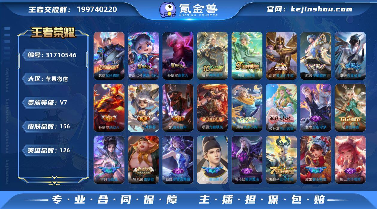 打野31段-发育路33段 苹果WX-V7-最强王者段位-126英雄-156皮肤-1典藏皮肤-8传说-4限定-18印记-3按键 【英雄全皮】:影全皮 【荣耀典藏】:韩信弑枪猎影 【传说皮肤】:后羿神树通天,桑启鸣野蒿,赵云淬星耀世,李元芳飞鸢探春,铠绛天战甲,虞姬云霓雀翎,后羿黄金射手座,孙悟空地狱火 【限定皮肤】:李白谪仙醉月,狄仁杰阴阳师,赵云皇家上将,孙尚香蔷薇恋人,庄周高山流水,芈月白晶晶,狄仁杰魔术师,狄仁杰万华元夜,达摩沙漠行僧,项羽海滩派对,程咬金演武夺筹,兰陵王金庭之子,李元芳云中旅人,虞姬霸王别姬,钟馗驱傩正仪,雅典娜黎明之约,鬼谷子原初探秘者,鬼谷子五谷丰年,苏烈千军破阵,百里玄策原初追逐者,梦奇顽趣,沈梦溪大漠名商,裴擒虎擒涛扼浪,猪八戒猪悟能,鲁班大师探海日志,桑启海盐诗旅,艾琳女武神,张良古海寻踪,蒙恬荣光圣徽,鬼谷子天穹祈灯,程咬金群星魔术团 【赛季限定】:鬼谷子原初探秘者,狄仁杰万华元夜,程咬金演武夺筹,钟馗驱傩正仪,苏烈千军破阵,达摩沙漠行僧,兰陵王金庭之子,沈梦溪大漠名商,李元芳云中旅人,桑启海盐诗旅,裴擒虎擒涛扼浪,鲁班大师探海日志,张良古海寻踪,鬼谷子天穹祈灯,东皇太一噬灭天穹,太乙真人谧流熔炉,钟馗虚灵犬护,亚瑟荣光之誓,百里玄策原初追逐者,雅典娜黎明之约,梦奇顽趣,蒙恬荣光圣徽,牛魔星界战将,项羽九幽镇关 【战令限定】:周瑜线条小狗 【史诗皮肤】:赵云皇家上将,貂蝉圣诞恋歌,甄姬冰雪圆舞曲,王昭君偶像歌手,狄仁杰魔术师,廉颇地狱岩魂,宫本武藏鬼剑武藏,孙尚香蔷薇恋人,孙尚香水果甜心,嬴政摇滚巨星,妲己魅力维加斯,妲己女仆咖啡,吕布圣诞狂欢,曹操幽灵船长,李白千年之狐,吕布末日机甲,张飞乱世虎臣,虞姬霸王别姬,刘邦德古拉伯爵,夏侯惇乘风破浪,小乔缤纷独角兽,兰陵王暗隐猎兽者,...