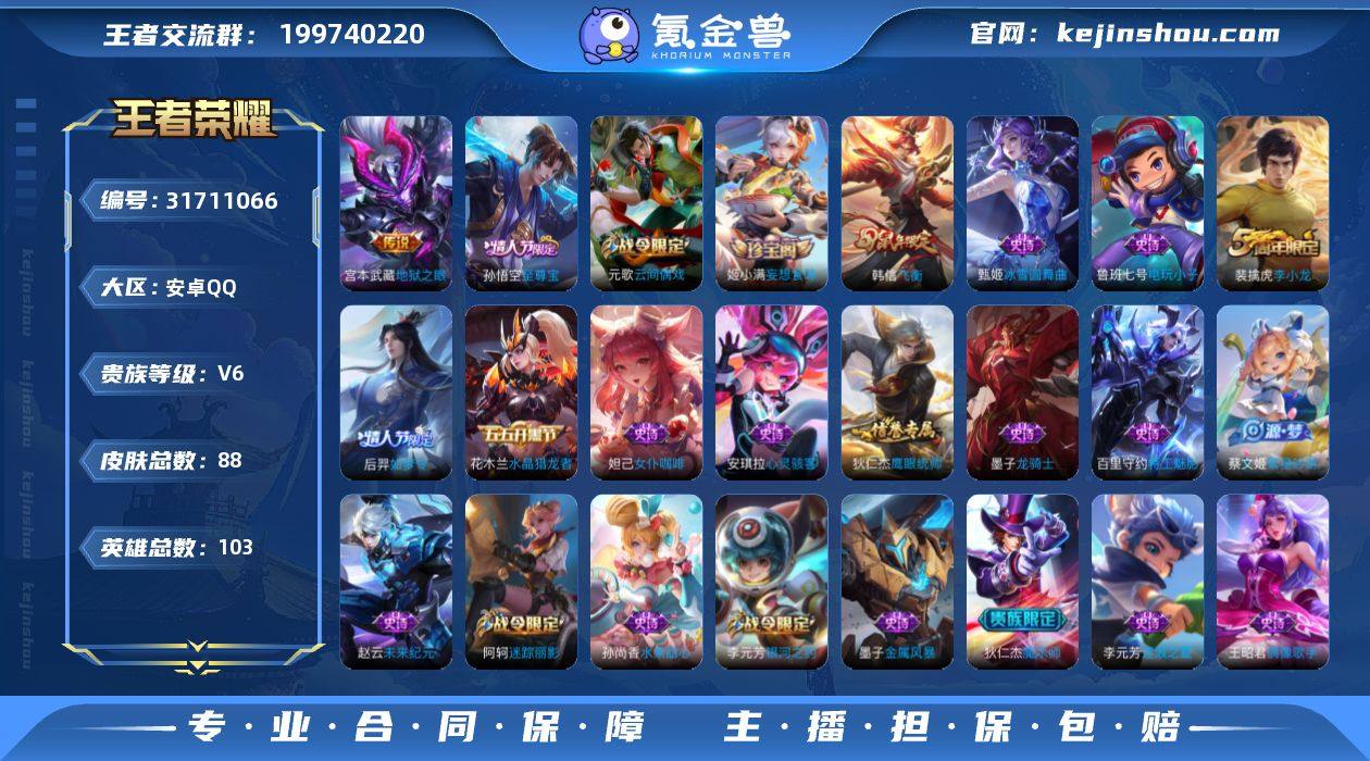 【WZ180811】安卓Q-至尊星耀I段位-106英雄-83皮肤-2传说-19史诗【传说皮肤】:花木兰冠军飞将,宫本武藏地狱之眼【限定皮肤】:狄仁杰阴阳师,夏侯惇朔风刀,狄仁杰万华元夜,老夫子醍醐杖,程咬金演武夺筹,孙悟空至尊宝,钟馗驱傩正仪,鬼谷子原初探秘者,弈星混沌棋,明世隐疑决卦,裴擒虎李小龙,盾山御銮,艾琳女武神【赛季限定】:盾山御銮,夏侯惇朔风刀,弈星混沌棋,明世隐疑决卦,老夫子醍醐杖,鬼谷子原初探秘者,狄仁杰万华元夜,程咬金演武夺筹,钟馗驱傩正仪,太乙真人谧流熔炉,甄姬逆浪荇歌,亚瑟荣光之誓【战令限定】:周瑜线条小狗【史诗皮肤】:貂蝉圣诞恋歌,王昭君偶像歌手,廉颇地狱岩魂,宫本武藏鬼剑武藏,孙尚香水果甜心,妲己魅力维加斯,墨子金属风暴,曹操幽灵船长,孙悟空至尊宝,李元芳逐浪之夏,孙策猫狗日记,狄仁杰鹰眼统帅,娜可露露晚萤,裴擒虎李小龙,镜真我赫兹,扁鹊灵蛊蚀心,黄忠百相守梦,西施织梦人,女娲万灵启世,周瑜线条小狗【其他皮肤】:韩信教廷特使,韩信街头霸王,露娜哥特玫瑰,阿轲爱心护理,达摩大发明家,赵云忍炎影,芈月红桃皇后,艾琳女武神,安琪拉玩偶对对碰,妲己少女阿狸,典韦黄金武士,亚瑟死亡骑士,达摩拳王,花木兰兔女郎,狄仁杰阴阳师,刘备纽约教父,宫本武藏霸王丸,诸葛亮掌控之力,吕布野性能量,盾山御銮,沈梦溪鲨炮海盗猫,夏侯惇朔风刀,弈星混沌棋,哪吒次元突破,鲁班七号黑桃队长,明世隐疑决卦,老夫子醍醐杖,鬼谷子原初探秘者,狄仁杰万华元夜,程咬金演武夺筹,钟馗驱傩正仪,猪八戒潮玩探月行,姬小满零食大作战,廉颇功夫炙烤,大司命暗都幽影,太乙真人谧流熔炉,戈娅玫蓝誓约,甄姬逆浪荇歌,庄周锦麟游梦,莱西奥踏浪烽翎,鬼谷子克喵,亚瑟荣光之誓,艾琳鹤鸣心笺,虞姬溯影追猎,鲁班七号福禄兄弟,鲁班七号木偶奇...