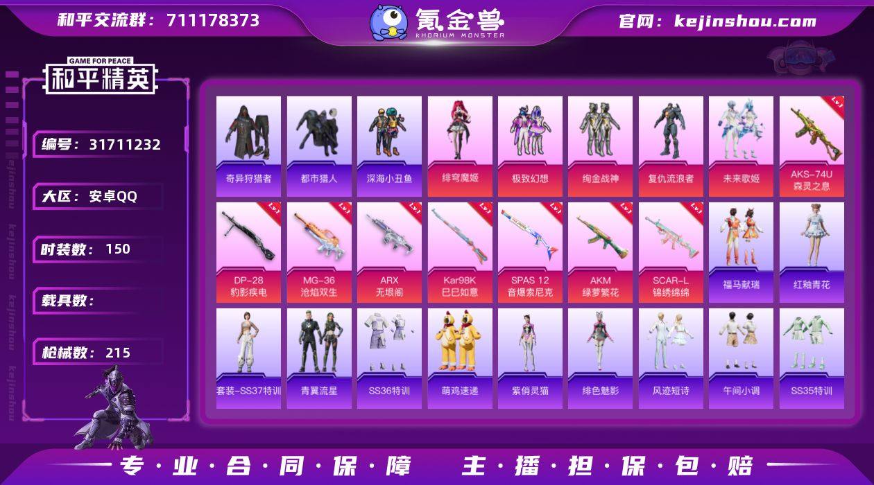 可二次实名【都市男神星河浪客绚金战神11特效枪6粉装素材号 秒换绑不用等】 安卓Q区-61159热力值-1印记-150套装-215枪皮 【3稀有】 都市猎人 奇异狩猎者 星河浪客【6粉装】 绚金战神 圣堂之誓 极致幻想 复仇流浪者 未来歌姬 角色-绯穹魔姬【11特效枪】 AKS-74U-森灵之息(5级) Mk14-福马献瑞(5级) AA12-G-萌骑幻想(1级) UMP45-萌骑冒险(2级) SCAR-L-锦绣绵绵(5级) SPAS-12-音爆索尼克(7级) AKM-绿萝繁花(5级) ARX-无垠阁(7级) Kar98K-巳巳如意(5级) DP-28-豹影疾电(5级) MG-36-沧焰双生(5级)【201热门】 浪漫天命 鹰眼刺客 小丑鱼 迅捷狂鲨 暗影哥特(红眼罩) 极速红龙 M416-快乐主宰 白色伏地魔 SS27特训 SS26特训 SS25特训 SS23特训 SS22特训 SCAR-L-玉兔迎春 GROZA-田园牧歌 AUG-幻影战神 M762-天降萌叽 Mk47-乌木金纹 SKS-糯团青竹 UZI-娇憨猪猪 M249-彩虹符号 MG3-幻世战舞者 AKM-星之彼岸 M416-蓝色火焰 长空猛禽 夏日倾情 妙红点点 懵萌河马 魅力单车 蓝色运动 橘黑制服 活力之心 黄色运动 漫步者 黄色伏地魔 S686-奇异狩猎者 黑色伏地魔 海岛探路者 淡雅花蕊 纯真浪花 春日漫步 风华少年志 M24-奇异狩猎者 M762-奇异狩猎者 AA12-G-雨过天青 沙漠之鹰-雨过天青 Mini14-绯穹魔姬 P90-紫矿核心 M16A4-雨过天青 AC-VAL-玩趣呆呆 雨过天青 冰河战士 MG-36-薄荷星砂 GROZA-福马献瑞 SS34特训 朱霞炽焰 S1897-荧海星豚 AWM-天降萌叽 福马献瑞 凌霄紫焰 临安公主 龙魂突击队 萝兰蝴蝶 ACE32-冰晶雪宝 擎苍青焰 青翼流星 SS28特训 海盐绵绵冰 红潮炫舞 SS31特训 SS33特训 巳巳如意 狂花道·娜可露露 绯色魅影 M762-雏菊兔兔 雪绒豹 游乐 Mini14-雏菊兔兔 焰鹰斗篷 R189