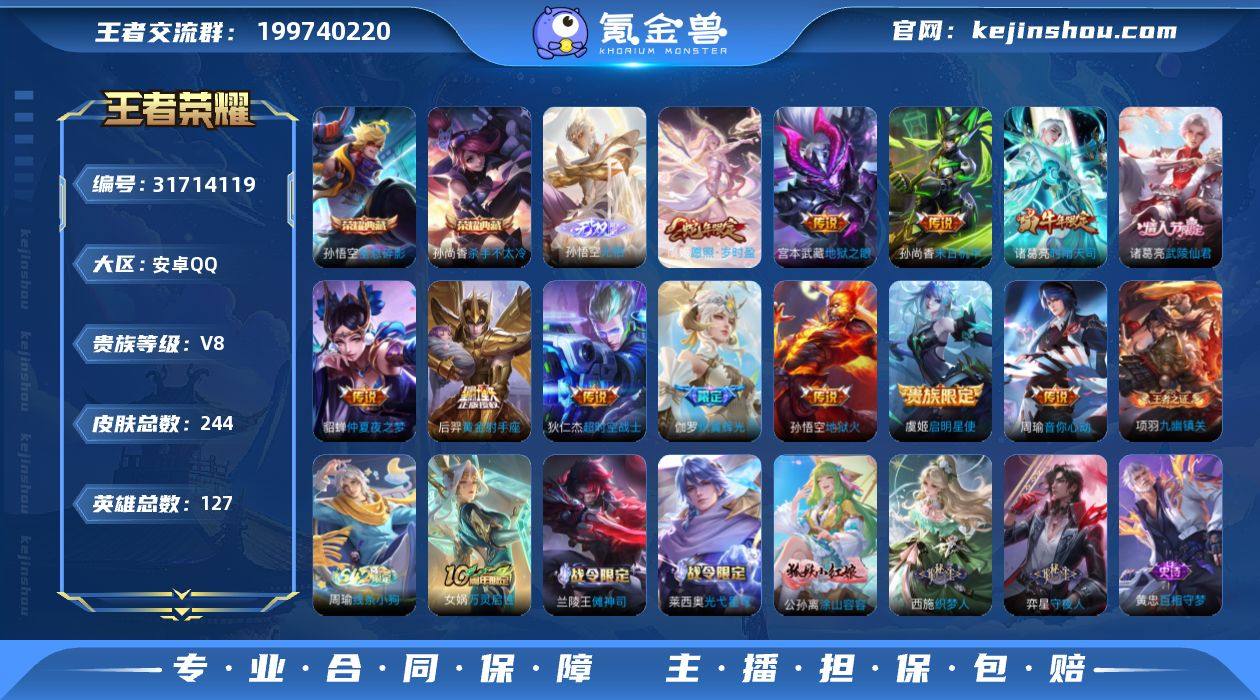 安卓Q-无二次-V8(71027分)-244皮-2典藏-1无双 -12传说-4786场-有百星印记-【最新段位以实际为准,截图仅供参考】 【英雄全皮】:孙权全皮,空空儿全皮,影全皮 【荣耀典藏】:孙悟空全息碎影,孙尚香杀手不太冷 【无双皮肤】:孙悟空无相 【传说皮肤】:虞姬愿照岁时盈,伽罗炽翼辉光,周瑜音你心动,诸葛亮时雨天司,虞姬启明星使,后羿黄金射手座,诸葛亮武陵仙君,貂蝉仲夏夜之梦,孙尚香末日机甲,宫本武藏地狱之眼,孙悟空地狱火,狄仁杰超时空战士 【限定皮肤】:狄仁杰阴阳师,赵云皇家上将,赵云龙胆,墨子神迹守卫,鲁班七号狮舞东方,芈月重明,芈月白晶晶,周瑜赤莲之焰,元歌云间偶戏,夏侯惇朔风刀,曹操天狼征服者,典韦穷奇,马可波罗暗影游猎,狄仁杰魔术师,狄仁杰万华元夜,项羽海滩派对,老夫子醍醐杖,老夫子航海奇遇记,安琪拉魔法小厨娘,程咬金演武夺筹,兰陵王驯魔猎人,亚瑟潮玩骑士王,牛魔御旌,虞姬启明星使,钟馗神迹守卫,钟馗驱傩正仪,蔡文姬繁星吟游,鬼谷子原初探秘者,诸葛亮武陵仙君,诸葛亮时雨天司,黄忠烈魂,弈星混沌棋,沈梦溪星空之诺,明世隐疑决卦,裴擒虎李小龙,狂铁御狮,米莱狄御霄,云中君纤云弄巧,伽罗炽翼辉光,盾山御銮,上官婉儿梁祝,艾琳女武神,张良古海寻踪,蒙恬荣光圣徽,鬼谷子天穹祈灯 【年限皮肤】:诸葛亮时雨天司,马超神威,黄忠烈魂,赵云龙胆,伽罗炽翼辉光 【赛季限定】:芈月重明,夏侯惇朔风刀,典韦穷奇,狄仁杰万华元夜,老夫子醍醐杖,程咬金演武夺筹,张良古海寻踪,牛魔御旌,钟馗驱傩正仪,鬼谷子原初探秘者,弈星混沌棋,明世隐疑决卦,狂铁御狮,米莱狄御霄,盾山御銮,鬼谷子天穹祈灯,蒙恬荣光圣徽 【战令限定】:墨子神迹守卫,鲁班七号狮舞东方,周瑜赤莲之焰,元歌云间偶戏,马可波罗暗影游猎,老夫子航海奇遇记,兰陵王驯...
