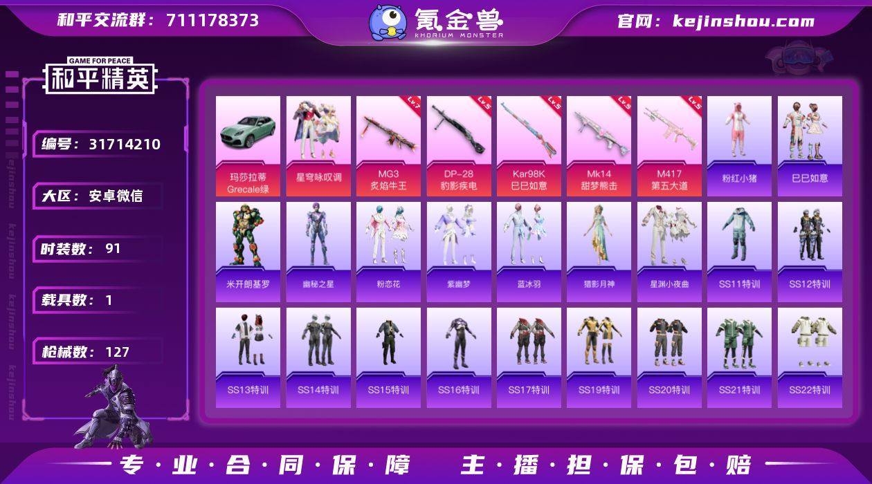 安卓 微信-1粉装-5特效枪-1载具-1粉色飞行器-39953热力值-9王牌印记-91套装-127枪皮 【热门品类】:套装-粉红小猪 【粉色套装】:粉装-星穹咏叹调 【粉色枪皮等级】:Kar98K-巳巳如意(五级),Mk14-甜梦熊击(五级),M417-第五大道(五级),DP-28-豹影疾电(五级),MG3-炙焰牛王(七级) 【粉色载具】:玛莎拉蒂Grecale(薄荷绿) 【粉色枪皮】:Kar98K-巳巳如意,Mk14-甜梦熊击,M417-第五大道,DP-28-豹影疾电,MG3-炙焰牛王 【粉色飞行器】:星夜魔法师飞行翼 【粉色降落伞】:筑梦精灵降落伞,垂柳戏鸭降落伞,鬼刀降落伞,圣辉之星降落伞,智耀战神降落伞,绯果甜心降落伞,百变魔方降落伞,幻星舰长降落伞 【稀有套装】:套装-巳巳如意,角色-米开朗基罗,角色-幽秘之星,套装-粉恋花,套装-紫幽梦,套装-蓝冰羽,角色-猎影月神,套装-星渊小夜曲 【稀有枪皮】:AKM-夜灯,AKM-彩虹符号,AKM-星之彼岸,AKM-环太平洋,AKM-破晓战魂,AKM-筑梦精灵,AKM-龙的传人,M16A4-幻世战舞者,M16A4-甜心亚梦,SCAR-L-炫彩节奏,SCAR-L-玉兔迎春,SCAR-L-红色方程式,M416-糯团青竹,M416-红色方程式,M416-蓝色火焰,GROZA-彩虹符号,GROZA-田园牧歌,AUG-耀粉歌者,QBZ-彩虹符号,QBZ-飞驰魅影,M762-天降萌叽,M762-牛气冲天,AC-VAL-天降萌叽,AC-VAL-彩虹甜喵,AC-VAL-甜心亚梦,蜜獾-天降萌叽,蜜獾-娇憨猪猪,UZI-啾咪啾咪,UZI-娇憨猪猪,UZI-炫彩节奏,UZI-烈焰拳霸,UMP45-生命誓言,UMP45-诡娃娃,UMP45-绒宝小鹅,Vector-生命誓言,Vector-田园牧歌,汤姆逊-耀粉歌者,AKS-74U-鬼刀,P90-飞驰魅影,P90-巳巳如意,Kar98K-炫彩节奏,Kar98K-飞驰魅影,Kar98K-星穹咏叹调,M24-炫彩节奏,M24-奇异狩猎者,VSS-田园牧歌,Mini14-炫彩节奏,Win94-星兔领航员,SLR-娇憨猪猪,AMR-翩跹演武,S686-橘柚倾心,S686-生命...