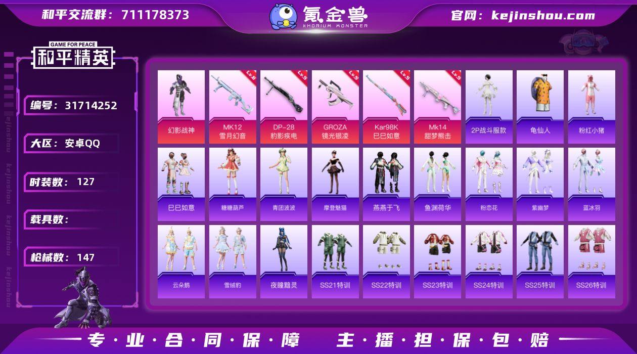 安卓 手Q-1粉装-7特效枪-0载具-0粉色飞行器-39814热力值-11王牌印记-127套装-147枪皮 【热门品类】:角色-2P战斗服款,套装-龟仙人,套装-粉红小猪 【粉色套装】:粉装-幻影战神 【粉色枪皮等级】:GROZA-镜光银凌(五级),Kar98K-巳巳如意(五级),Mk14-甜梦熊击(五级),MK12-雪月幻音(六级),DP-28-豹影疾电(五级) 【粉色枪皮】:GROZA-镜光银凌,Kar98K-巳巳如意,Mk14-甜梦熊击,Mk14-福马献瑞,MK12-雪月幻音,DP-28-豹影疾电 【粉色降落伞】:幻影战神降落伞,星穹咏叹调降落伞,极意拳锋降落伞 【稀有套装】:套装-龟仙人,套装-巳巳如意,套装-糖糖葫芦,套装-青团波波,角色-摩登魅猫,套装-燕燕于飞,套装-鱼渊荷华,套装-粉恋花,套装-紫幽梦,套装-蓝冰羽,套装-云朵鹅,套装-雪绒豹,角色-夜瞳黯灵 【稀有枪皮】:AKM-彩虹符号,AKM-破晓战魂,AKM-龙的传人,M16A4-幻世战舞者,M16A4-红色方程式,SCAR-L-夜灯,SCAR-L-炫彩节奏,SCAR-L-红色方程式,M416-糯团青竹,M416-红色方程式,M416-蓝色火焰,GROZA-2B战斗服款,AUG-天降萌叽,AUG-耀粉歌者,QBZ-彩虹符号,M762-天降萌叽,M762-第五大道,M762-云朵鹅,蜜獾-天降萌叽,UZI-啾咪啾咪,UZI-天降萌叽,UZI-影袭,UZI-红色方程式,UMP45-夜灯,UMP45-涂山之恋,UMP45-炫光之旅,UMP45-蓝色火焰,Vector-彩虹符号,Vector-生命誓言,汤姆逊-天降萌叽,汤姆逊-幻影战神,汤姆逊-耀粉歌者,P90-巳巳如意,Kar98K-红色方程式,M24-炫彩节奏,AWM-音爆索尼克,SKS-炫彩节奏,SKS-糯团青竹,VSS-彩虹符号,Mini14-穿刺龙虾,Mini14-耀粉歌者,SLR-彩虹符号,M417-惊鸿侠骨,M200-惊鸿侠骨,SVD-云朵鹅,S686-生命誓言,S686-巳巳如意,S12K-玩趣呆呆,S12K-破晓战魂,S12K-夜灯,S12K-极意拳锋,DBS-彩虹符号,DBS-月影灵韵,SPAS-12-云朵鹅,M249-彩虹...