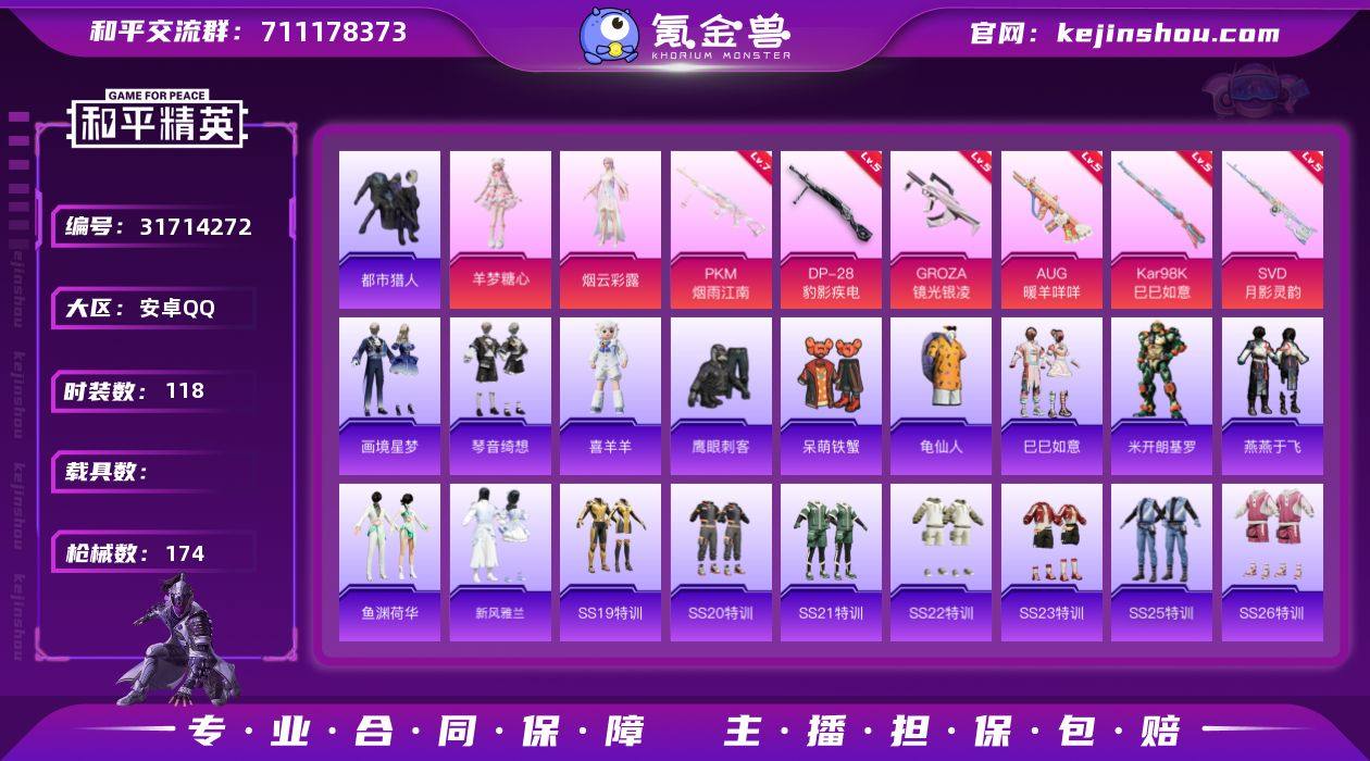 安卓 手Q-2粉装-9特效枪-0载具-0粉色飞行器-46896热力值-6王牌印记-118套装-174枪皮 【热门品类】:套装-都市猎人,套装-龟仙人 【粉色套装】:角色-烟云彩露,角色-羊梦糖心 【粉色枪皮等级】:GROZA-镜光银凌(五级),AUG-暖羊咩咩(五级),AKS-74U-森灵之息(五级),Kar98K-巳巳如意(五级),SVD-月影灵韵(五级),DP-28-豹影疾电(五级),PKM-江南烟雨(七级) 【粉色枪皮】:GROZA-镜光银凌,AUG-暖羊咩咩,AKS-74U-森灵之息,Kar98K-巳巳如意,Mk14-福马献瑞,SVD-月影灵韵,DP-28-豹影疾电,PKM-江南烟雨 【粉色降落伞】:蜜语绒猫降落伞,江南烟雨降落伞,忍者神龟降落伞,脆鲨七海降落伞,动力核心降落伞,荧海星豚降落伞,异瞳寒姬降落伞 【稀有套装】:套装-龟仙人,套装-巳巳如意,角色-米开朗基罗,套装-燕燕于飞,套装-鱼渊荷华,套装-新风雅兰,玩偶服-喜羊羊,套装-画境星梦,套装-琴音绮想 【稀有枪皮】:AKM-影袭,AKM-江南烟雨,AKM-破晓战魂,AKM-缤纷海域,AKM-霓虹街区,AKM-龙的传人,M16A4-幻世战舞者,M16A4-红色方程式,M16A4-蓝色火焰,SCAR-L-炫彩节奏,SCAR-L-玉兔迎春,SCAR-L-红色方程式,SCAR-L-小狗蛇点点,M416-糯团青竹,M416-红色方程式,M416-蓝色火焰,GROZA-彩虹符号,GROZA-影袭,AUG-天降萌叽,AUG-耀粉歌者,QBZ-彩虹符号,M762-天降萌叽,M762-彩虹符号,AC-VAL-天降萌叽,AC-VAL-快闪甜心,蜜獾-天降萌叽,ACE32-画境星梦,UZI-啾咪啾咪,UZI-天降萌叽,UZI-影袭,UZI-炫彩节奏,UZI-红色方程式,UMP45-夜灯,UMP45-炫光之旅,UMP45-生命誓言,UMP45-蓝色火焰,Vector-焰鹰斗篷,Vector-生命誓言,汤姆逊-天降萌叽,汤姆逊-炫彩节奏,汤姆逊-耀粉歌者,MP5K-画境星梦,AKS-74U-鬼刀,P90-快闪甜心,P90-巳巳如意,Kar98K-彩虹符号,Kar98K-影袭,Kar98K-王子的夏天,Kar98K-...