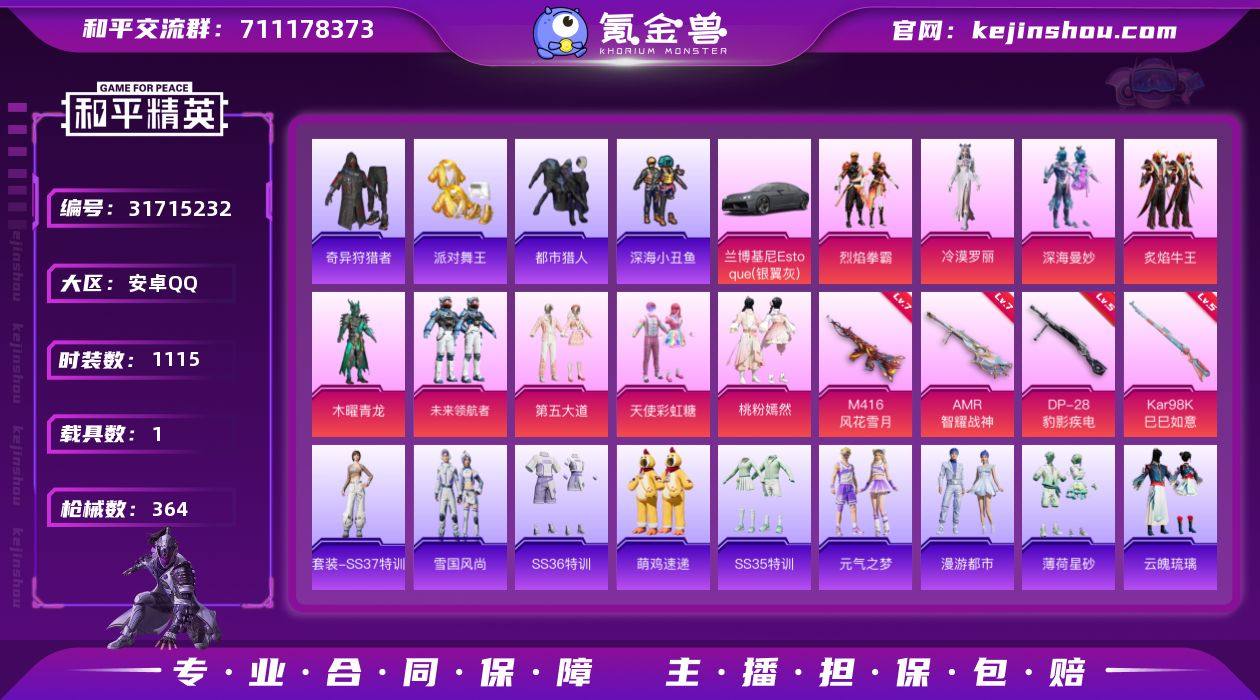 实名:可二次实名 是否支持人脸包赔:支持 粉装数量:9 特效枪数量:4 载具数:1 时装数:1115 枪械数:364 奇异狩猎者,都市猎人,派对舞王,深海小丑鱼 炙焰牛王,第五大道,冷漠罗丽,烈焰拳霸,木曜青龙,深海曼妙,天使彩虹糖,桃粉嫣然,未来领航者 七级AMR-智耀战神,七级M416-风花雪月,五级DP-28-豹影疾电,五级Kar98K-巳巳如意 兰博基尼Estoque(银翼灰) 狙击之神,SS37特训,雪国风尚,SS36特训,奇异狩猎者,萌鸡速递,SS35特训,元气之梦,漫游都市,薄荷星砂,云魄琉璃,凌霄紫焰,擎苍青焰,SS34特训套装,朱霞炽焰,艾克斯奥特曼,暗影哥特,暗夜傀儡,碧波幻想,冰川特警,冰冻风暴,缤纷果语,暴风机械师,缤纷焰火,北国孤狼,滨海厨神,滨海假日,白虎圣者,冰河战士,白糯汤圆,冰爽风暴,白色伏地魔,贝斯之夜,白啸长虹,白熊同盟,冰原使者,白月香洋装,春光漫游,雏菊兔兔,长空猛禽,丛林猎人,潮流先锋,潮流炫酷,潮流游乐家,超能勇士,传奇侦探,春日漫步,仓鼠灰灰,晨曦薄雾,炽焰拳师,顶瓜瓜,蝶变,大橘大利,呆萌铁蟹,都市猎人,都市魅力,风暴特警,飞驰魅影,风玲,风华少年志,粉红小猪,伏击者,疯狂小兔子,粉恋花,风行保卫者,福星高照,格斗专家,龟仙人,刚毅裁决者,光之冒险,贵族骑装,幻彩翩翩,红潮炫舞,海岛探路者,虎虎生威吉莉,湖蓝色名流,活力之心,荷畔雨呱,黑色刀锋,黑色伏地魔,黄色伏地魔,黄色格斗者,灰色格斗者,黄色名流,海上生明月,黄色运动,红色运动,幻世战舞者,黑夜传说,幻影武者,极地朋克,酒红色名流,惊鸿侠骨,橘黑制服,娇憨猪猪,竞技达人朋克,竞技名士,竞技勇士朋克,吉莉礼服,坚韧舞者,极速红龙,极速竞梦,精神漫游,街头潮人,街头风暴,街舞达人,机械英豪,机械征服者,军械专家,锦衣飞扬,金羽特工,空岛之星,科技之星,快乐星愿,快闪甜心,狂沙舞者,空投萌叽,酷熊伴侣,旷野奇兵,狂战萌兔,蓝冰羽,蓝彩潮人,凛冬战士,拉斐尔,龙魂突击队,猎鹰,冷酷挑战者,玲珑飞花,萝兰蝴蝶,浪漫波比,黎明保卫者,猎梦纪元,浪漫天命,浪漫樱花,蓝色守护者,蓝色运动,莱茵河畔,恋语绒绒,冷焰舞者,漫步者,摩登魅猫,猛禽,妙红点点,萌黄之夏,魅力单车,麻辣教官,懵萌河马,萌趣咩咩,萌趣颜团子,迷域探索者,弄潮海豚,逆风勇士,霓虹极客,霓虹街区,怒火燎原,柠萌假日,牛气冲天,牛气满满,派对舞王,破蛋小黄鸡,破晓战魂,青春冒险家,轻风白浪,拳皇97草薙京,绮丽涂鸦,青年教官,青涩时光,青团波波,俏兔智灵,清新柠檬,云朵鹅,瑞龙福将,人气偶像,燃烧卡路里,圣诞大吉,圣殿骑士,双棍侠客,深海小丑鱼,时空追击者,深蓝冒险家,深蓝色名流,沙漠兵团,沙漠毒蛇,神气柴柴,SS10特训,SS11特训,SS12特训,SS13特训,SS14特训,SS15特训,SS16特训,SS17特训,SS18特训,SS19特训,SS20特训,SS21特训,SS22特训,SS23特训,SS24特训,SS25特训,SS26特训,SS27特训,SS28特训,SS29特训,SS30特训套装,SS31特训套装,SS32特训套装,SS33特训套装,SS5特训,SS6特训,SS7特训,SS8特训,SS9特训,巳巳如意,探宝勇士,童话森林,甜蜜菠萝,甜蜜告白,特殊使命,涂山之恋,糖糖葫芦,特训学院,甜心亚梦,团圆交子,田园牧歌,特战英豪,特种颜团子,特战装甲,完美偶像,王牌教练,万圣娃娃,小丑鱼,迅捷狂鲨,炫蓝之夏,小鸟芋圆,雪绒豹,旭日情侣,夏日倾情,夏日音浪,血色贵族,雪山精英,醒狮腾