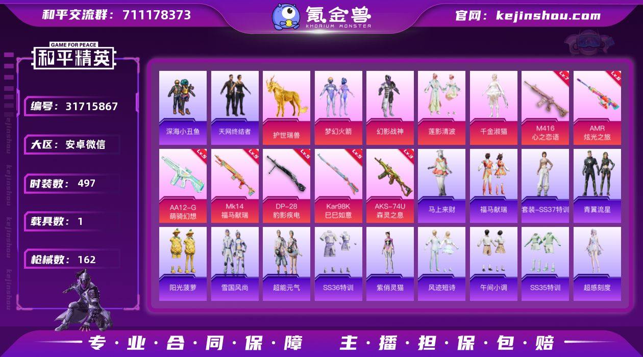 【 天网火箭幻影战神七特效带马】安卓微信-2王牌印记-4粉装-7特效枪-1载具-50613热力值-127套装-162枪皮-1卓越印记【4粉装】套装-梦幻火箭,套装-莲影清波,角色-千金淑猫,套装-幻影战神【7特效枪】Kar98K-巳巳如意/5级,AKS-74U-森灵之息/3级,Mk14-福马献瑞/5级,AA12-G-萌骑幻想/5级,M416-心之恋语/7级,AMR-炫光之旅/6级,DP-