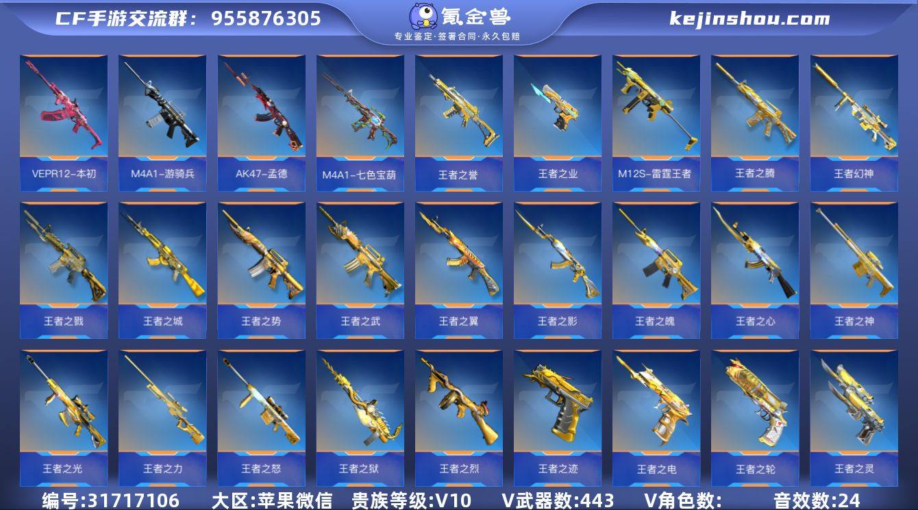 B652139 V王者角色数0 王者V武器数量95 英雄武器数量443 音效卡数量24 万化数量1032 VIP等级【文本】VIP10级 【专家S】 【支持】 【是】 【可排位】 三国系列10 三国系列:AK47-常胜,AK47-策,M4A1-星象,M4A1-仲达,SCAR-文远,MK47-仁德,AWM-妙才,TAC-慈,AK47-奉先,AK47-孟德;