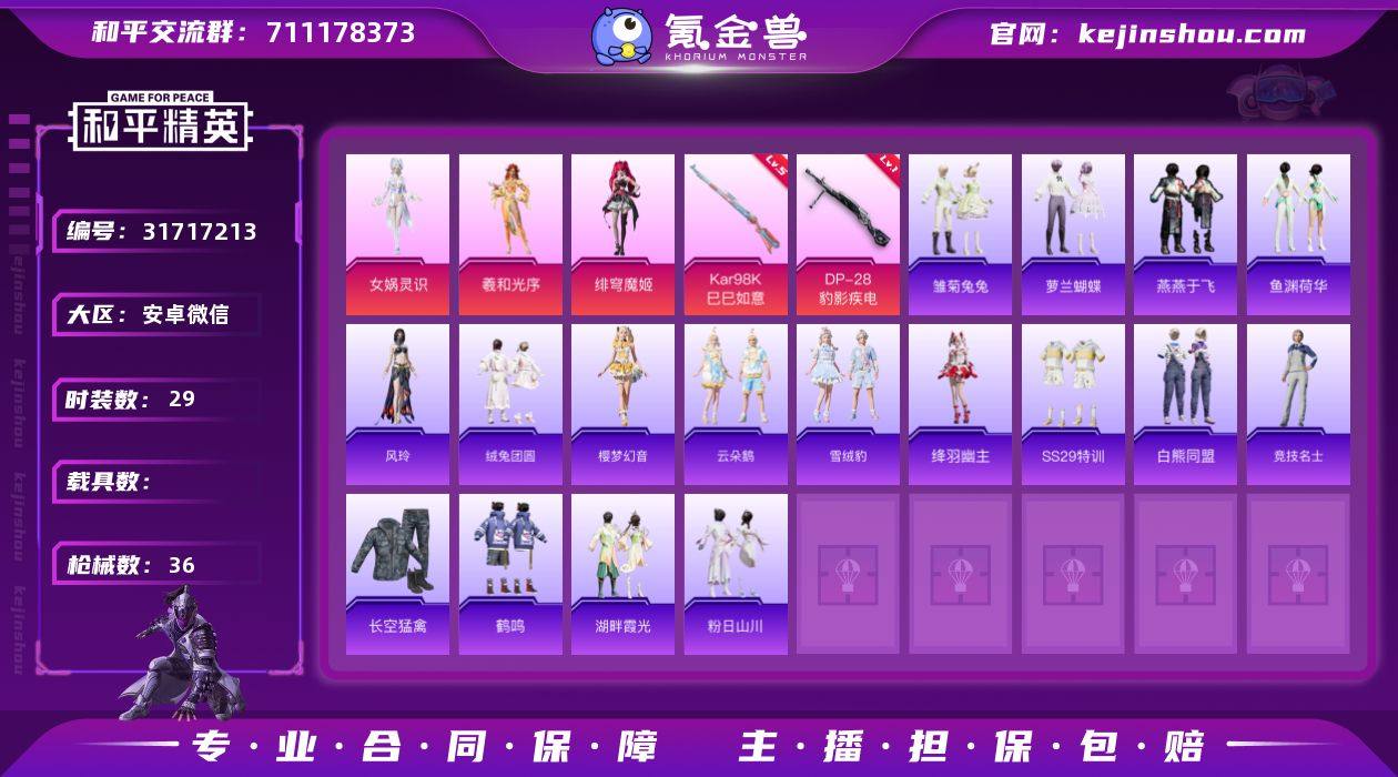 安卓 微信-3粉装-2特效枪-0载具-1粉色飞行器-12669热力值-1王牌印记-29套装-36枪皮 【粉色套装】:角色-女娲灵识,角色-羲和光序,角色-绯穹魔姬 【粉色枪皮等级】:Kar98K-巳巳如意(五级),DP-28-豹影疾电(一级) 【粉色枪皮】:Kar98K-巳巳如意,DP-28-豹影疾电 【粉色飞行器】:冠军兔兔飞行器 【粉色降落伞】:金丰海韵降落伞,未来领航者降落伞,赛博古神降落伞,月下星之子降落伞,智耀战神降落伞,星穹咏叹调降落伞,灵猫魔法师降落伞,绯穹魔姬降落伞,喜羊羊与灰太狼降落伞 【稀有套装】:套装-雏菊兔兔,套装-萝兰蝴蝶,套装-燕燕于飞,套装-鱼渊荷华,角色-风玲,套装-绒兔团圆,套装-樱梦幻音,套装-云朵鹅,套装-雪绒豹,角色-绛羽幽主 【稀有枪皮】:AKM-缤纷海域,M416-红色方程式,M762-云朵鹅,AC-VAL-天降萌叽,SVD-云朵鹅,S686-生命誓言,SPAS-12-云朵鹅,MG3-幻世战舞者,沙漠之鹰-云朵鹅,大砍刀-云朵鹅,大砍刀-鬼刀 【其他套装】:套装-SS29特训,套装-白熊同盟,套装-竞技名士,套装-长空猛禽,套装-鹤鸣,套装-湖畔霞光,套装-粉日山川 【稀有头盔】:深海小丑鱼头盔(2级) 【稀有背包】:深海小丑鱼背包(1级) 【营地ID】:972035171