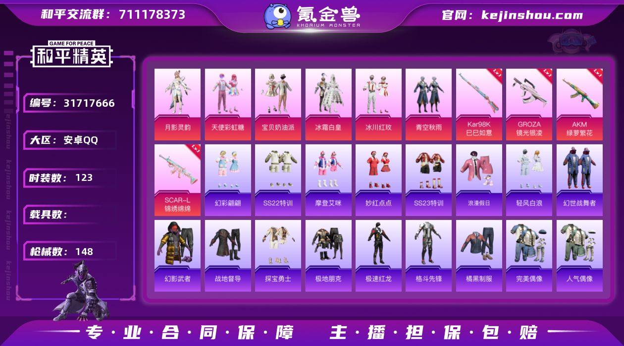 HX6939【身法素材号女号3绝世印记3传奇印记9王牌印记-6粉装宝贝奶油派 天使彩虹糖-4满级特效枪2飞行器-Mark.06蓝螳螂-132套装 147枪皮】(1太阳)双字ID可二次 安卓Q-40727热力值 3传奇印记 3绝世印记 9王牌印记 历史绝世王牌18星 132套装 147枪皮 【6粉装】 宝贝奶油派 天使彩虹糖 月影灵韵 青空秋雨 冰霜白皇 冰川红玫 【4特效枪】 SCAR-L-锦绣绵绵 (5级) AKM-绿萝繁花 (5级) Kar98K-巳巳如意 (5级) GROZA-镜光银凌 (5级) 【2飞行器】招财竹蜻蜓飞行器 冰柠泡泡飞行器【7热门】 Mark.06(螳螂)角色-摩登魅猫 棉花软糖 晶辉守护 龟仙人 浪漫假日 团圆交子 粉红小猪 破蛋小黄鸡 极速红龙 【1背包】 深海小丑鱼背包 营地ID:901552927安卓Q区-6粉装-4特效枪-40727热力值-9王牌印记-132套装-148枪皮【优质套装】: 宝贝奶油派 天使彩虹糖 月影灵韵 冰川红玫 冰霜白皇 青空秋雨【特效枪等级】:GROZA-镜光银凌(五级- GROZA-镜光银凌)Kar98K-巳巳如意(五级- Kar98K-巳巳如意)AKM-绿萝繁花(五级- AKM-绿萝繁花)SCAR-L-锦绣绵绵(五级- SCAR-L-锦绣绵绵)【优质武器皮肤】: GROZA-镜光银凌 Kar98K-巳巳如意 AKM-绿萝繁花 SCAR-L-锦绣绵绵【稀有武器皮肤】: QBZ-纯真浪花 AWM-纯真浪花 汤姆逊-纯真浪花 DBS-乌木金纹 AA12-G-纯真浪花 平底锅-纯真浪花 撬棍-朗基努斯之枪 GROZA-镜光银凌 Kar98K-巳巳如意 Mk14-冰河战士 UZI-冰河战士 M16A4-冰河战士 AKM-绿萝繁花 SCAR-L-锦绣绵绵 蜜獾-乌木金纹 PKM-啾咪啾咪 M416-红色方程式 M416-蓝色火焰 M416-糯团青竹 M416-月影鸳鸯 AKM-环太平洋 AKM-彩虹符号 AKM-龙的传人 SCAR-L-玉兔迎春 SCAR-L-甜蜜誓约 SCAR-L-夜灯 SCAR-