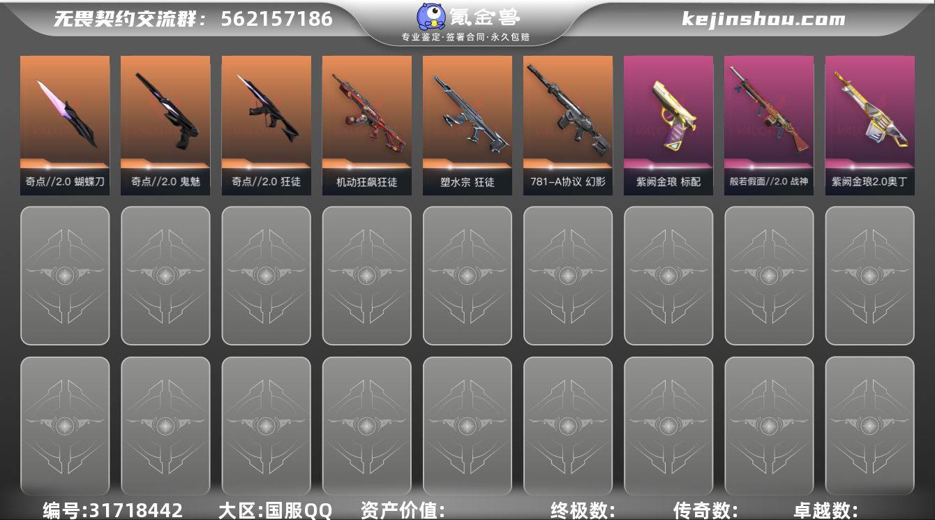 段位: 未定级 套装: 奇点//2.0套装 近战武器皮肤: 蝴蝶刀-奇点//2.0 步枪皮肤: 狂徒-机动狂飙,狂徒-塑水宗,幻影-781-A协议,狂徒-奇点//2.0 佩枪皮肤: 标配-紫阙金琅,鬼魅-奇点//2.0 机枪皮肤: 奥丁-紫阙金琅2.0,战神-般若假面//2.0