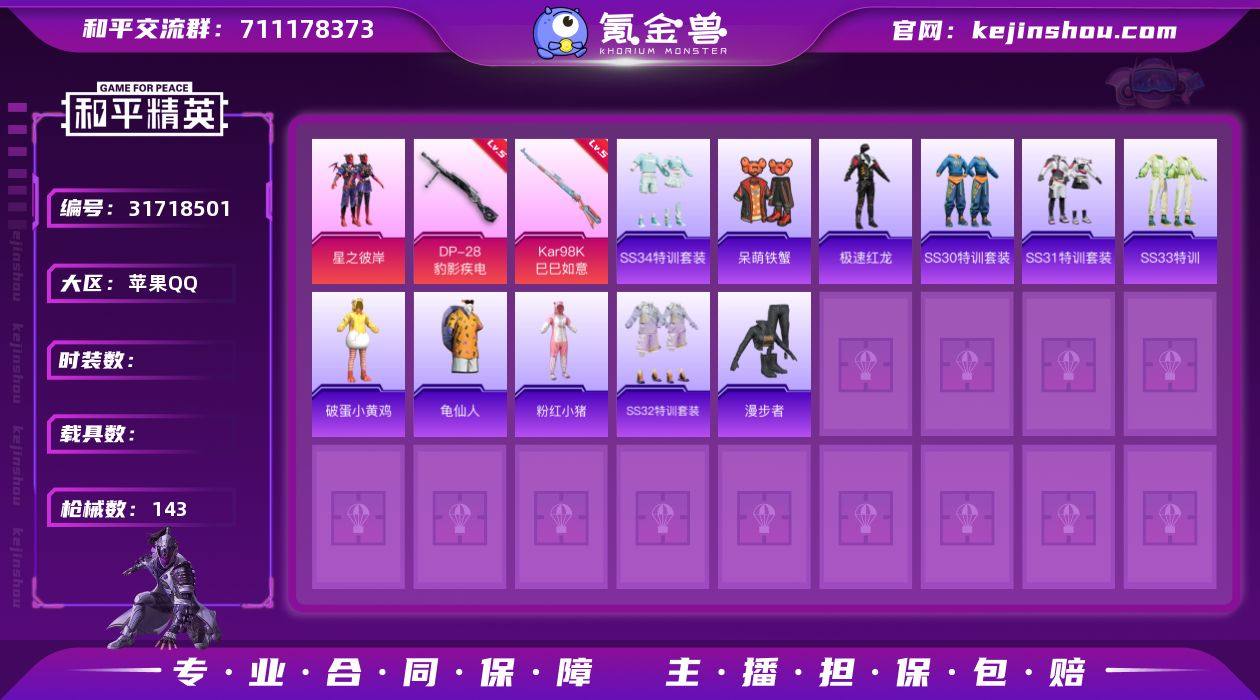 苹果Q 可二次 1粉装6特效枪2飞行器126套装143枪皮 星之彼岸 AKS-74U-森灵之息(5级) Kar98K-巳巳如意(5级) DP-28-豹影疾电(5级) AKS-74U-森灵之息(5级) Mk14-福马献瑞(5级) UMP45-萌骑冒险(2级) 精灵迷巫飞行器 星之彼岸飞行器 深海小丑鱼头盔 神秘黑猫背包 龟仙人 呆萌铁蟹 粉红小猪 漫步者 破蛋小黄鸡 极速红龙 和平精英账号