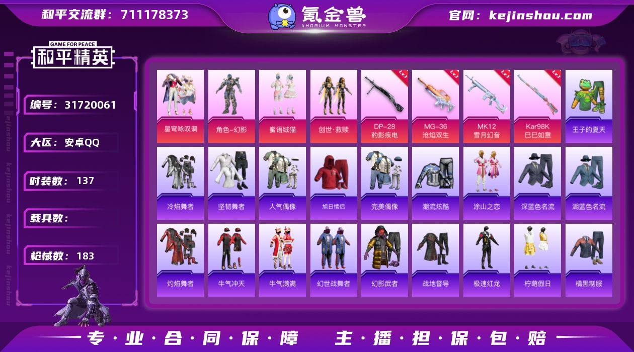 可二次【3粉装6特效枪可秒换绑】 安卓Q区-53231热力值-9印记-137套装-183枪皮 【3粉装】 创世·救赎 蜜语绒猫 星穹咏叹调【4特效枪】 MK12-雪月幻音(7级) Kar98K-巳巳如意(5级) DP-28-豹影疾电(5级) MG-36-沧焰双生(5级)【32热门】 M416-蓝色火焰 GROZA-彩虹符号 M762-暗夜鎏金 长空猛禽 虚音幻奏 甜心亚梦 暖心熊熊 牛气冲天 妙红点点 蜜语绒猫 懵萌河马 水银刺客 破蛋小黄鸡 极速红龙 冰公主 白色伏地魔 SS25特训 SS24特训 SS23特训 SS22特训 Mk47-洛神天依 Kar98K-王子的夏天 SCAR-L-玉兔迎春 GROZA-田园牧歌 M762-天降萌叽 Mk47-乌木金纹 UZI-娇憨猪猪 UMP45-蓝色火焰 M249-彩虹符号 MG3-幻世战舞者【2飞行器】 红色滑翔尾迹 炫彩糖果飞行器 营地ID:760882415