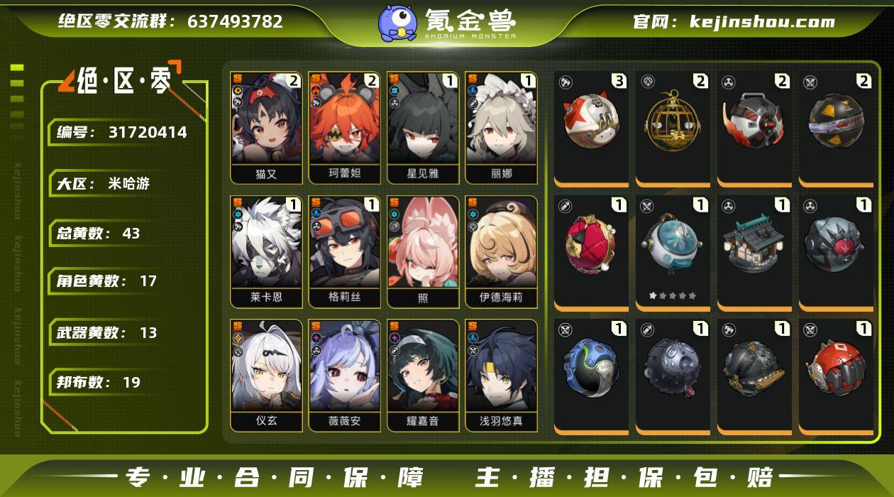 冒险等级:60 总黄数:43 五星角色数:17 菲林底片数量:3 菲林数量:34 加密母带数量:5 2命猫又,2命珂蕾妲,1命星见雅,1命丽娜,1命莱卡恩,1命格莉丝,0命照,0命伊德海莉,0命仪玄,0命薇薇安,0命耀嘉音,0命浅羽悠真,0命柏妮思·怀特,0命简,0命朱鸢,0命艾莲,0命「11号」 6命真斗,6命波可娜,6命露西,6命苍角,6命派派,6命比利,6命本,6命安比,6命妮可,6命安东,6命可琳,3命赛斯,1命潘引壶 3精燃狱齿轮,2精青溟笼舍,2精嵌合编译器,2精硫磺石,1精玲珑妆匣,1精残心青囊,1精霰落星殿,1精淬锋钳刺,1精防暴者VI型,1精啜泣摇篮,1精拘缚者,1精钢铁肉垫,1精深海访客 5精阿崔巡查,4精格列佛探员,3精狮耶,2精墨丘利,1精阿饭,1精芽芽,1精比克布利克,1精艾丝弥小姐,1精罗宾,1精咔嚓仔,1精赤红莫库斯,1精鲨牙布,1精巴特勒,1精飚速布,1精艾米莉安,1精阿全,1精插头布,1精左轮布,1精共鸣布 狡黠甜心,晴澜双迹套装,漪光夜曲