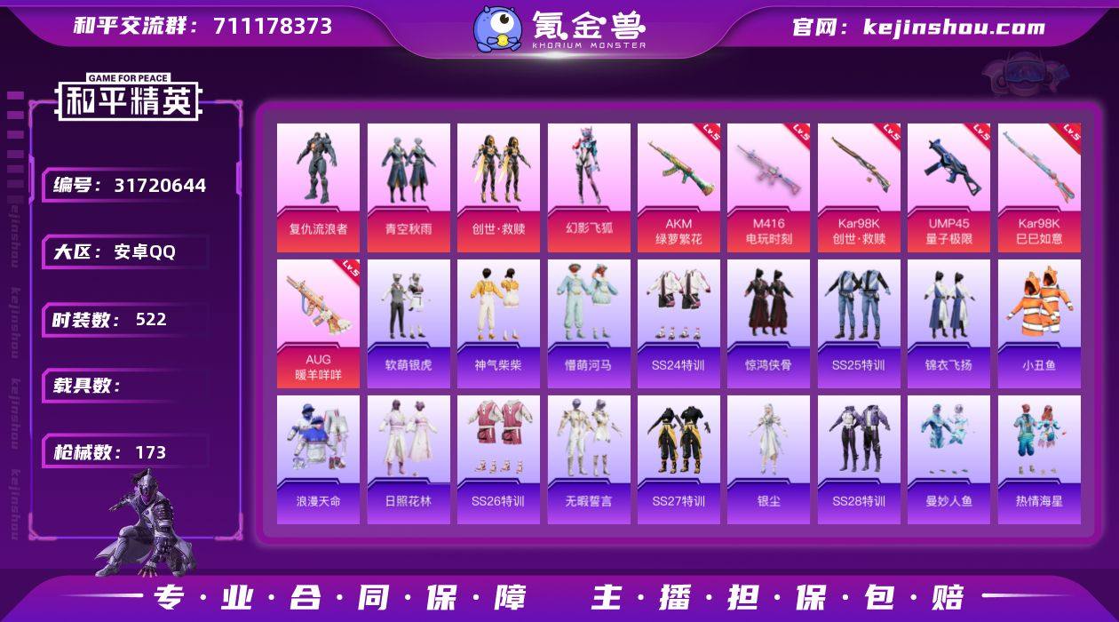 实名: 可修改 时装数: 522 枪械数: 173 战备数: 141 热门装扮: 复仇流浪者,软萌银虎,青空秋雨,创世·救赎,幻影飞狐 稀有枪皮: 黄金龙骨AWM,黄金龙骨SCAR-L,AKM绿萝繁花,M416电玩时刻,Kar98K创世·救赎,UMP45量子极限,Kar98K-巳巳如意,AUG-暖羊咩咩